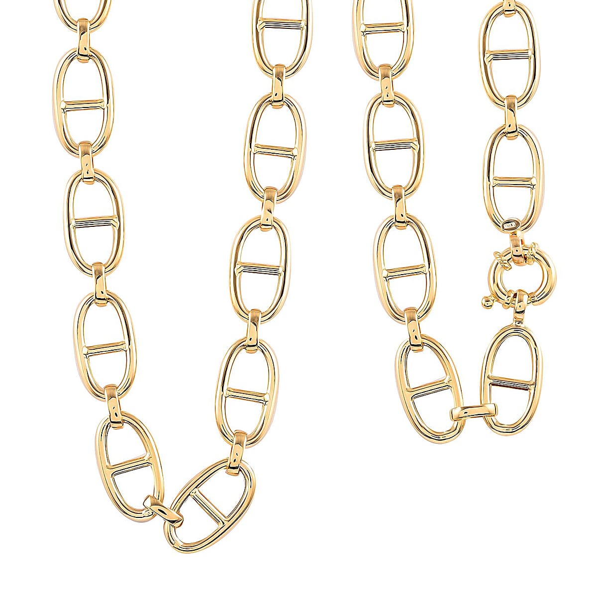 Set a new benchmark of beauty with this spectacular mariner necklace. The mariner necklace comprises interlocking oval links that have a bar directly down the center. This mariner necklace remarks the beauty of intricately designed metal links. The mariner necklace's beauty makes up a great wearable with your laid-back and formal outfits. Nothing can beat the classic vibes of a mariner necklace. This designer mariner chain features 10K yellow gold crafting and 18inches of princess length. Be classy wearing this gorgeous piece, bejeweled with natural metal luster.