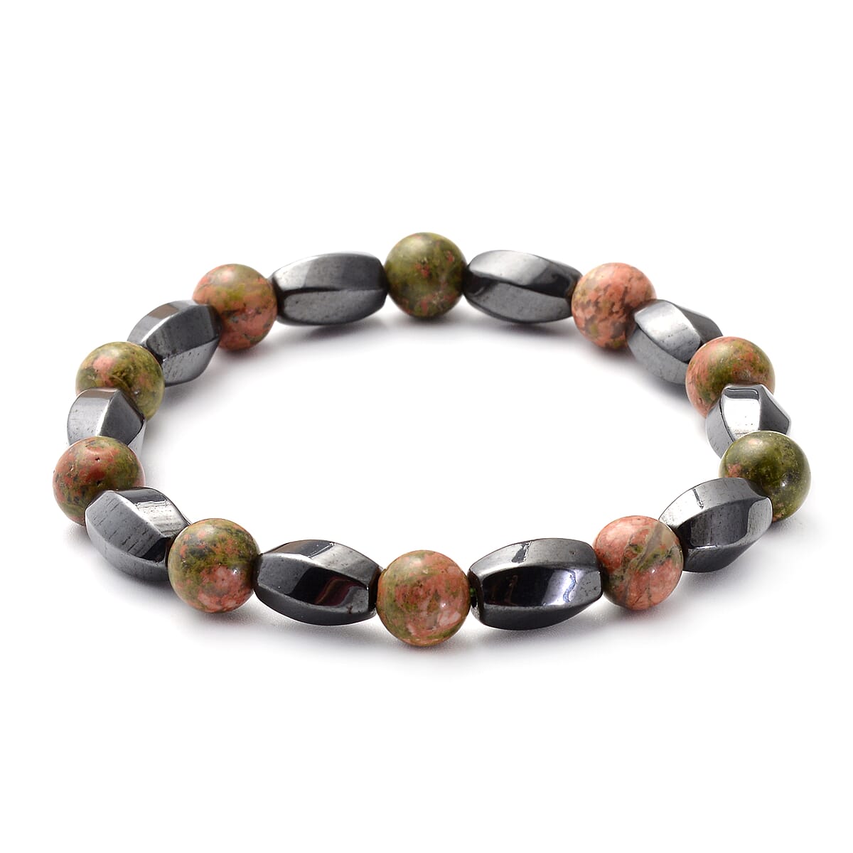 This beaded stretch bracelet from Magnetic by Design Collection is crafted to add a stylish appeal to your appearance. This stretch bracelet features round-shaped unakite beads and twisted barrel-shaped hematite beads in an alternate arrangement, offering brilliant color contrast. Wear this stunning bracelet alone or layer it with other bracelets for a fashionable look.