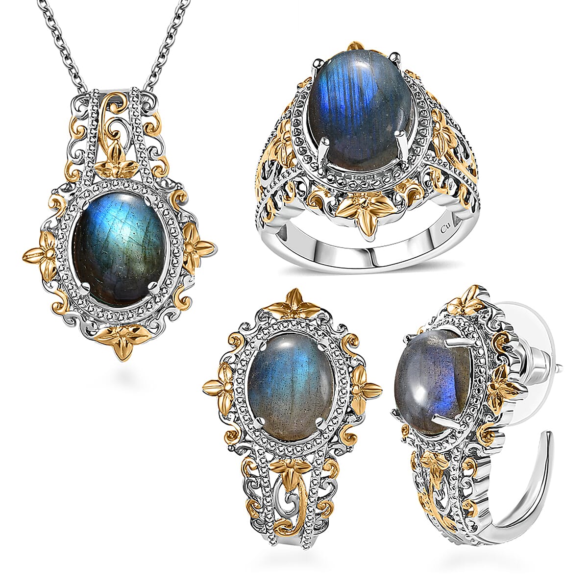 Elevate your elegance with this set of gemstone earrings, ring, and pendant. Soothing oval gemstones glow beautifully against dual-tone filigree details. Make this versatile jewelry set yours to express tranquility with refined sophistication.