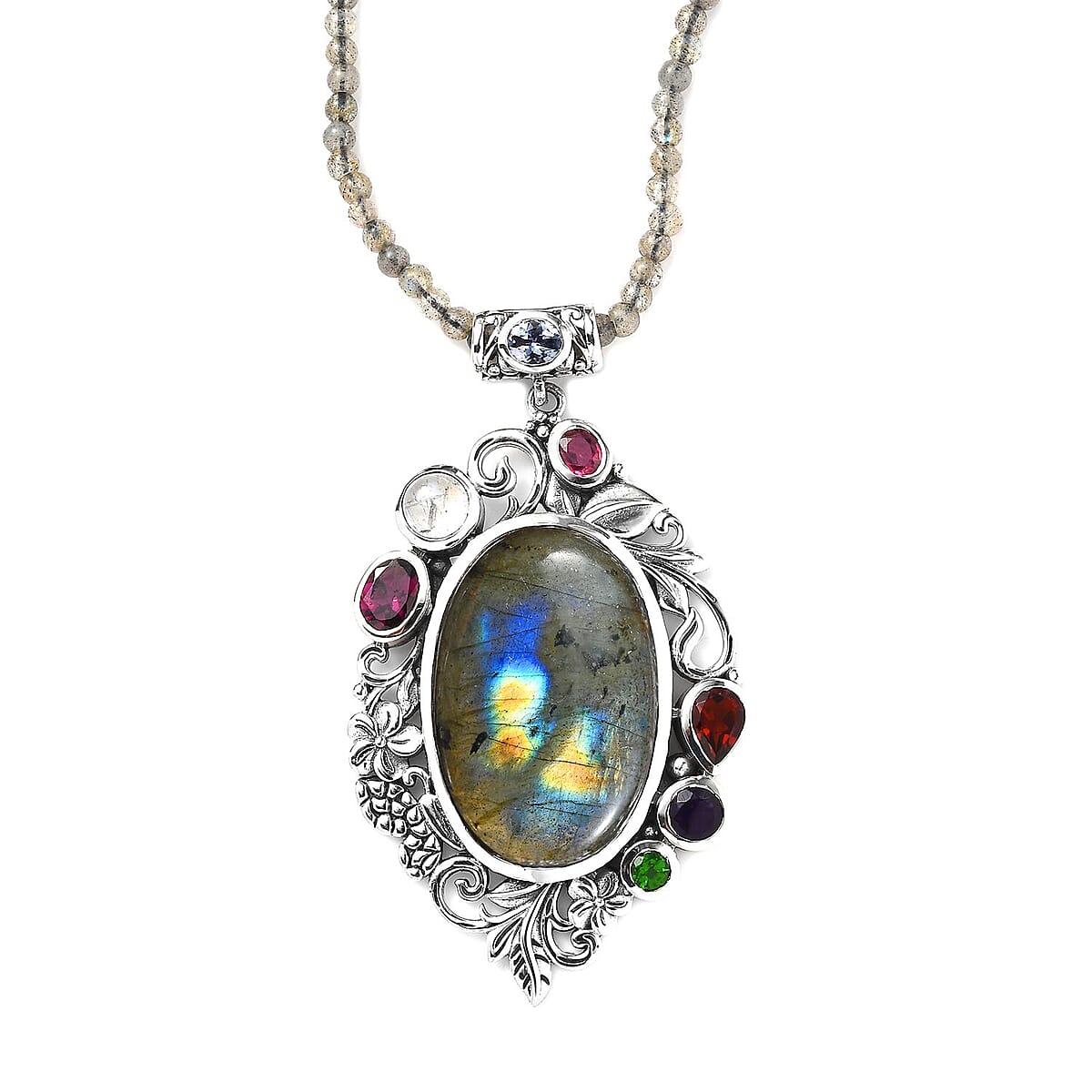 Immerse yourself in the captivating allure of our Malagasy labradorite pendant with beaded necklace. This sterling silver masterpiece is adorned with floral and leaf-like metalwork, featuring bezel-set labradorite with multi-gemstone accents. Each element is meticulously crafted to capture the essence of natural beauty.