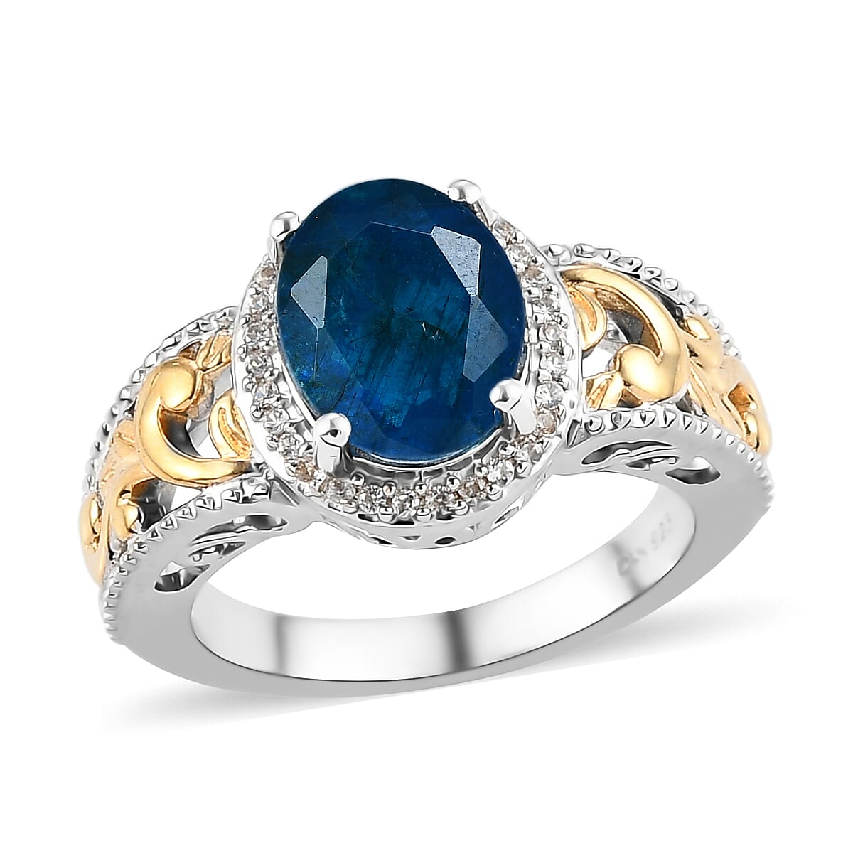 An epitome of artistic ingenuity, this Malgache neon apatite ring is a stunning blend of style and elegance, created with endless beauty. The oval-shaped neon apatite is enhanced with the halo of zircon rounds. The smooth metal scrolls on the shank further make this ring look more designer and appealing.