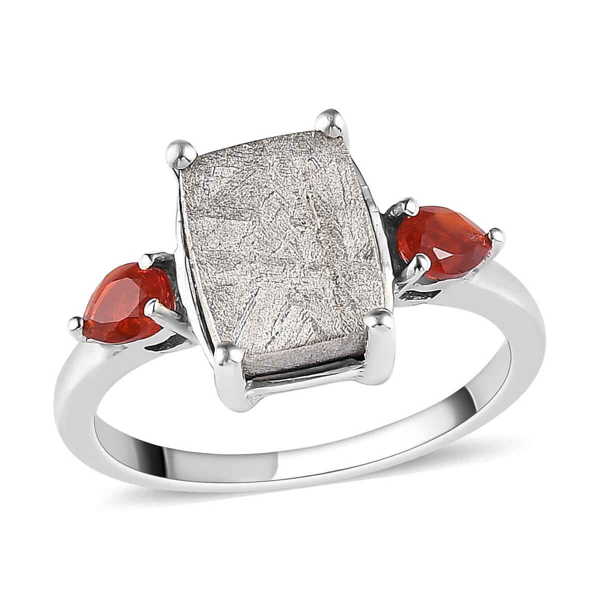Experience the celestial dance between the heavens and Earth with the marvelous meteorite ring. A symphony of a cushion-shaped meteorite, flanked by fiery pear-shaped Mexican opals, captures the essence of the universe on your finger. This trilogy ring, set in luminous platinum over sterling silver, is not just a piece of jewelry—it's a cosmic tale of passion and wonder.