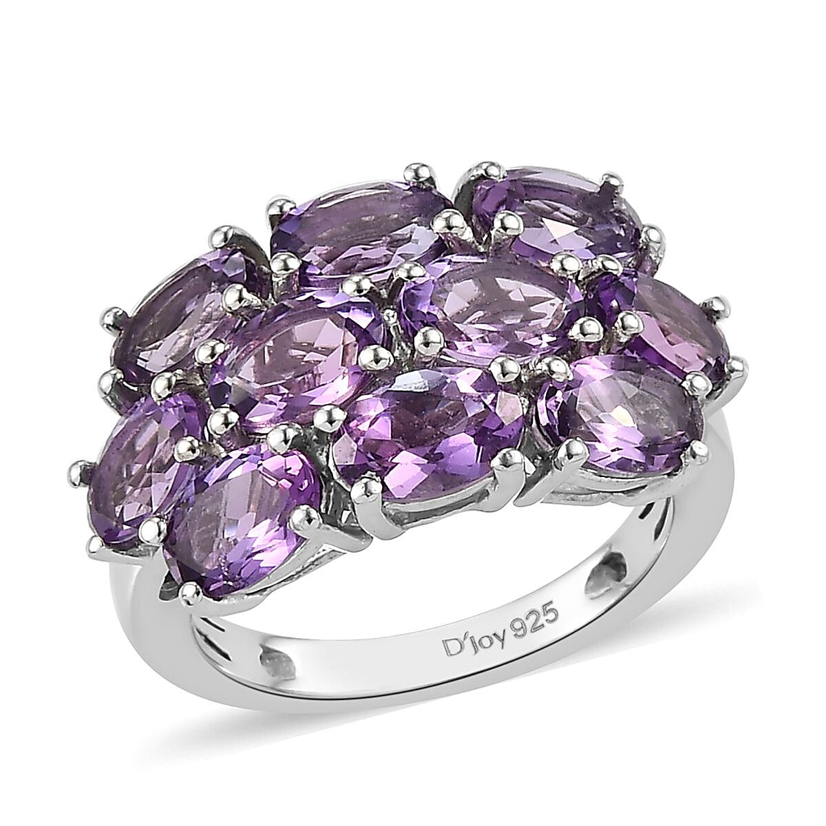 Inspired by the cluster theme, this Mashamba amethyst ring symbolizes spirituality and contentment. Similar to flaunting the beauty of lavender flowers bunch, this ring is designed with closely set Mashamba amethyst accents. The visible prong locks create an exquisite metal-beaded sparkle. Mashamba Amethyst is a beautiful gemstone that beguiles us with its subtle shades of purple color. This variety of amethyst showcases a royal appeal. Crafted in platinum-plated sterling silver this ring epitomizes beauty, comfort and durability.