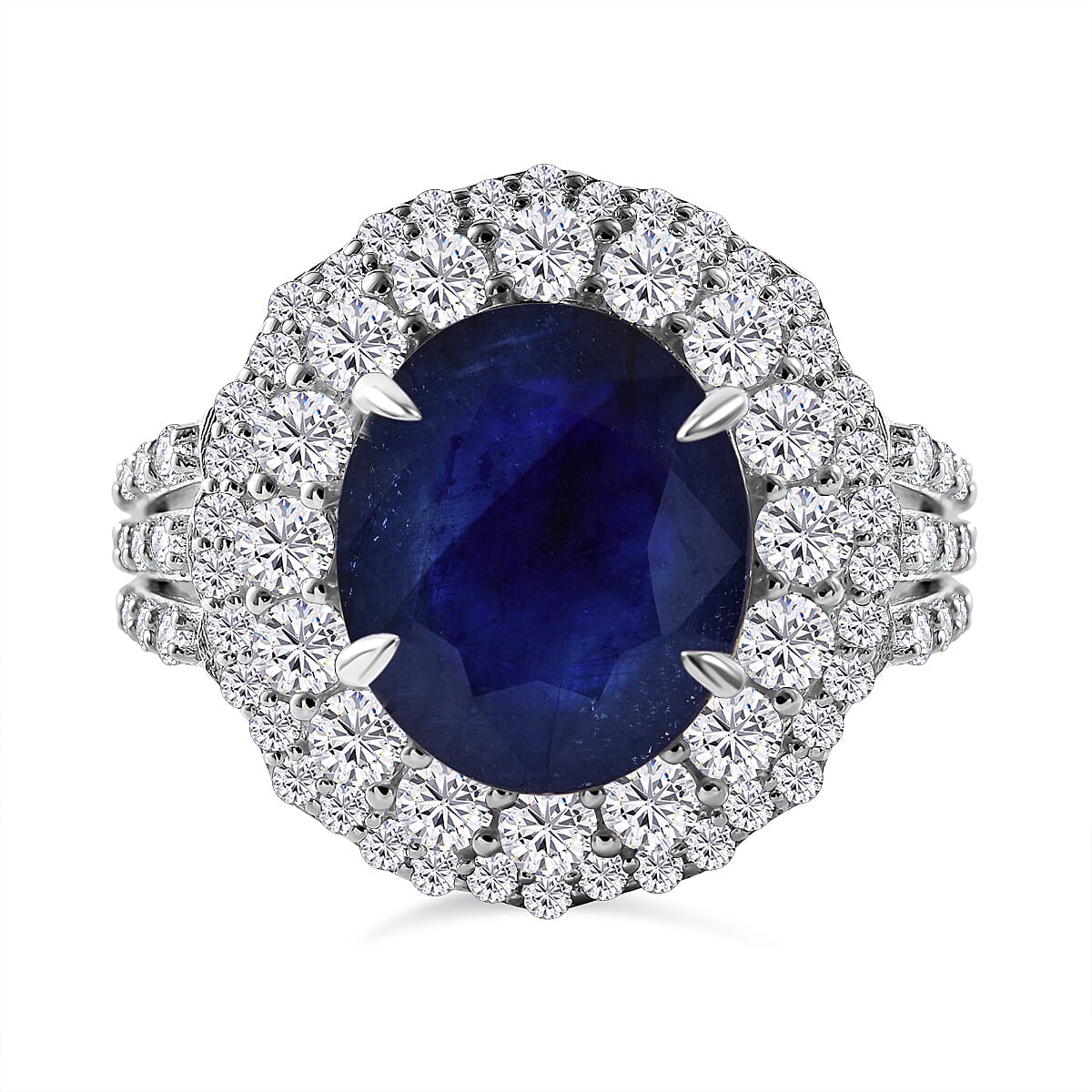 Masoala Sapphire (D) and White Topaz Double Halo Ring in Platinum Over Sterling Silver (Size 7.0) 9.30 ctw