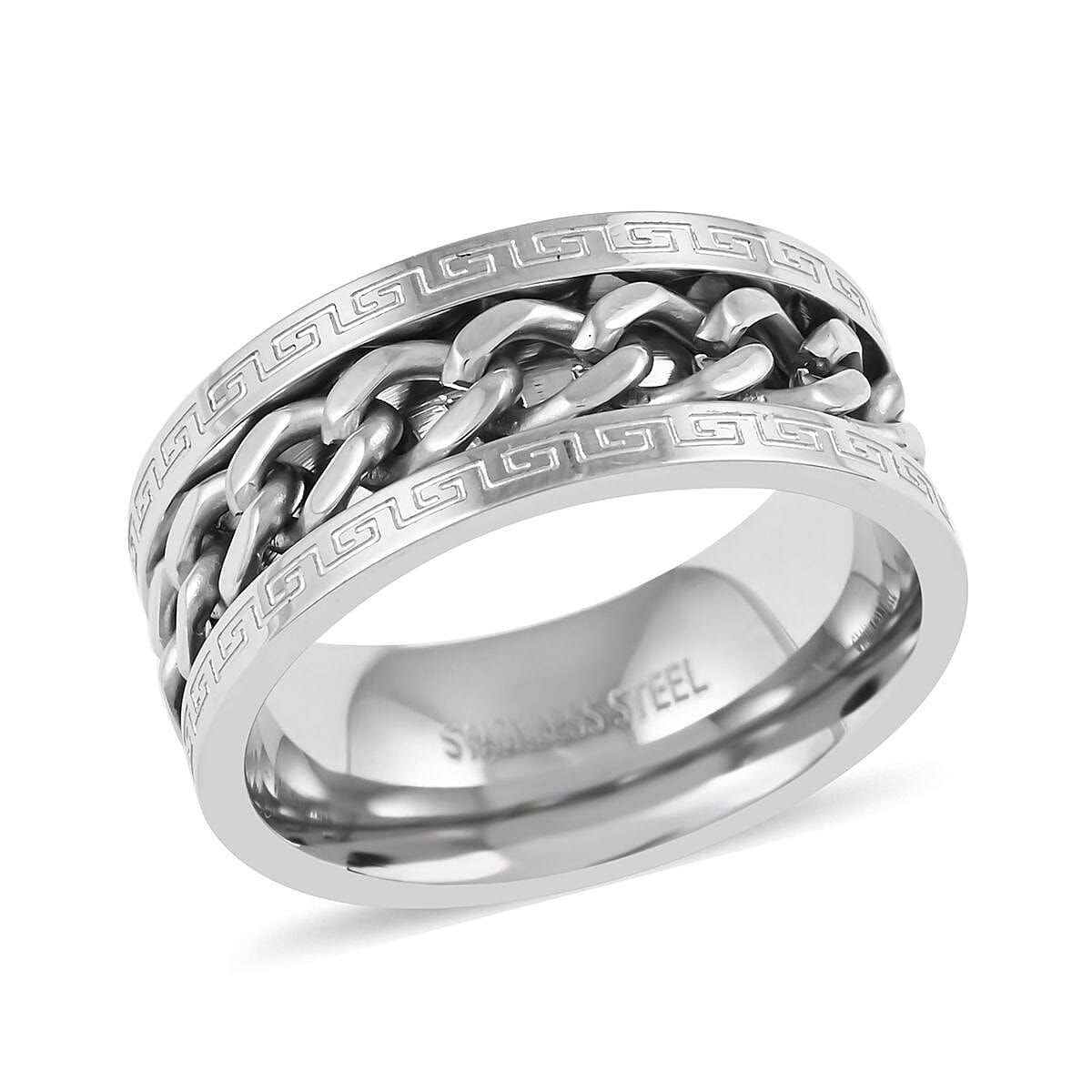 Introducing our men's ring in stainless steel, a bold and contemporary accessory that combines a classic band design with a touch of geometric flair. Crafted with durable stainless steel, this band ring features a unique curb design with interlocking links, completed by a geometric framework. It is a stylish statement piece that adds a modern edge to any outfit.