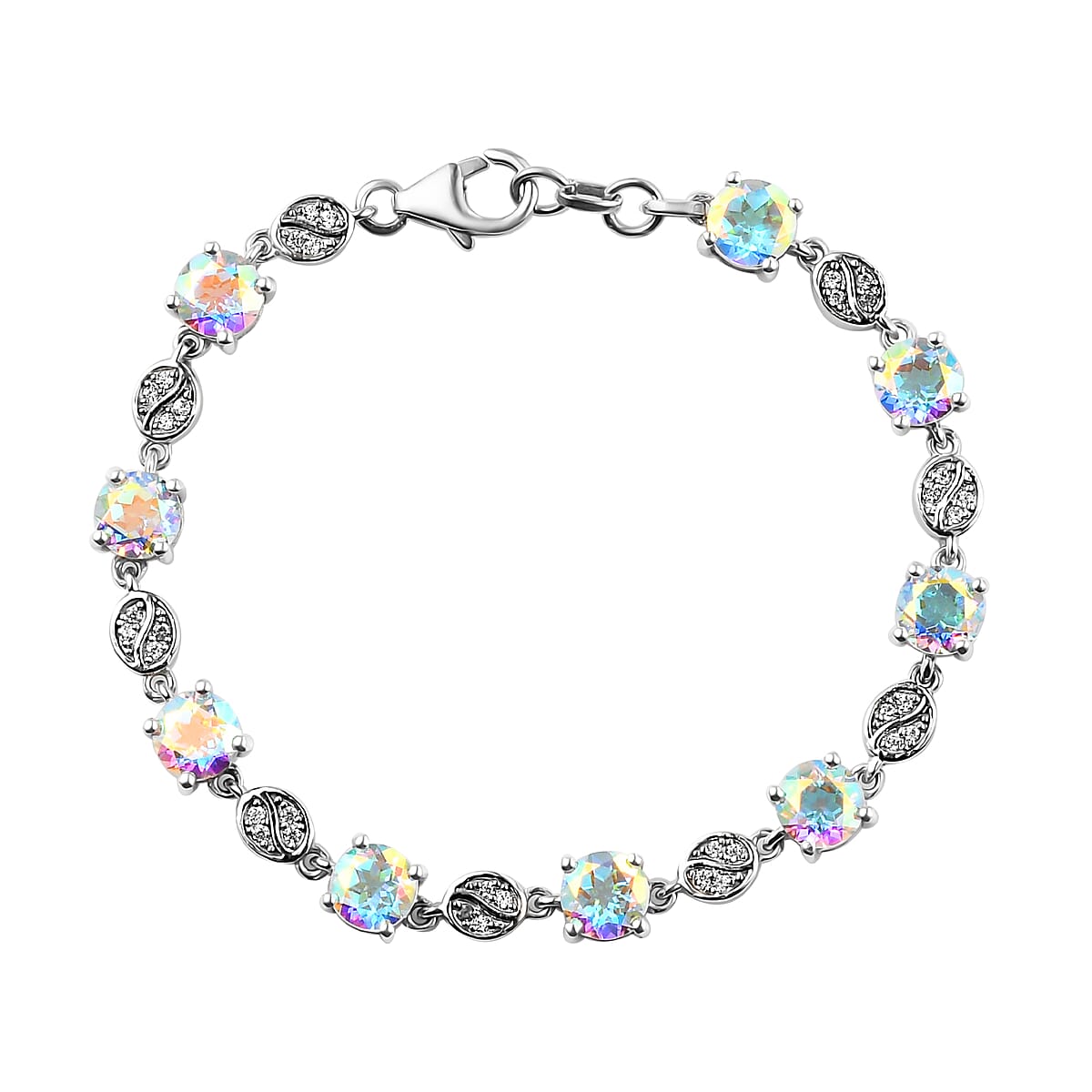 The mercury mystic topaz natural white zircon link bracelet draws inspiration from the minimalist theme. The multi-color mystic topaz is encrusted in the bracelet's frame. White zircons are embedded alternatively with the topaz in a round-shaped frame. The link bracelet is crafted in sterling silver with a platinum coating to sustain the long-lasting luster. Adorn this link bracelet with outfits of different colors. It will suit your colorful personality instantly.