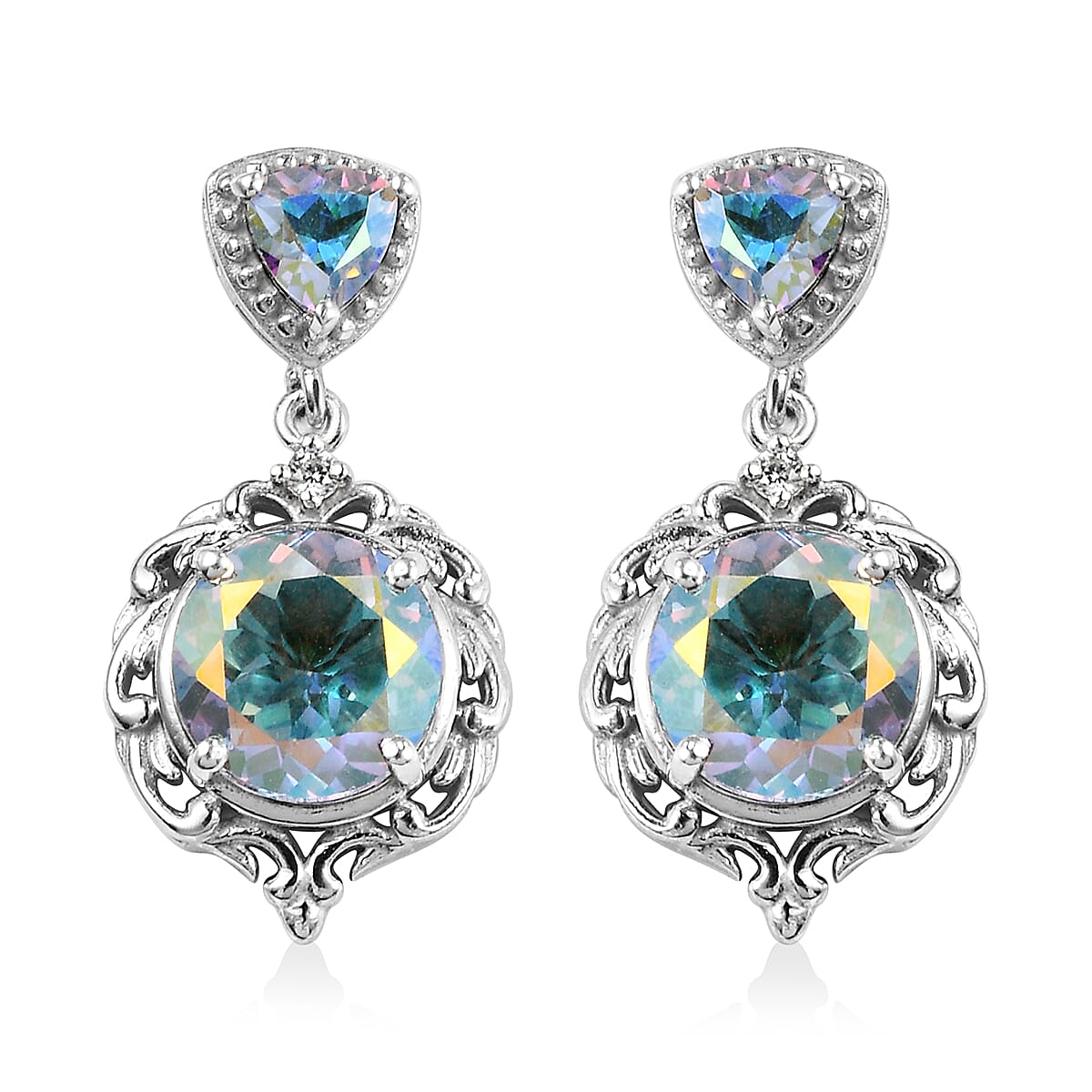 Mercury Mystic Topaz and White Zircon Dangling Earrings in Platinum Over Sterling Silver 7.40 ctw
