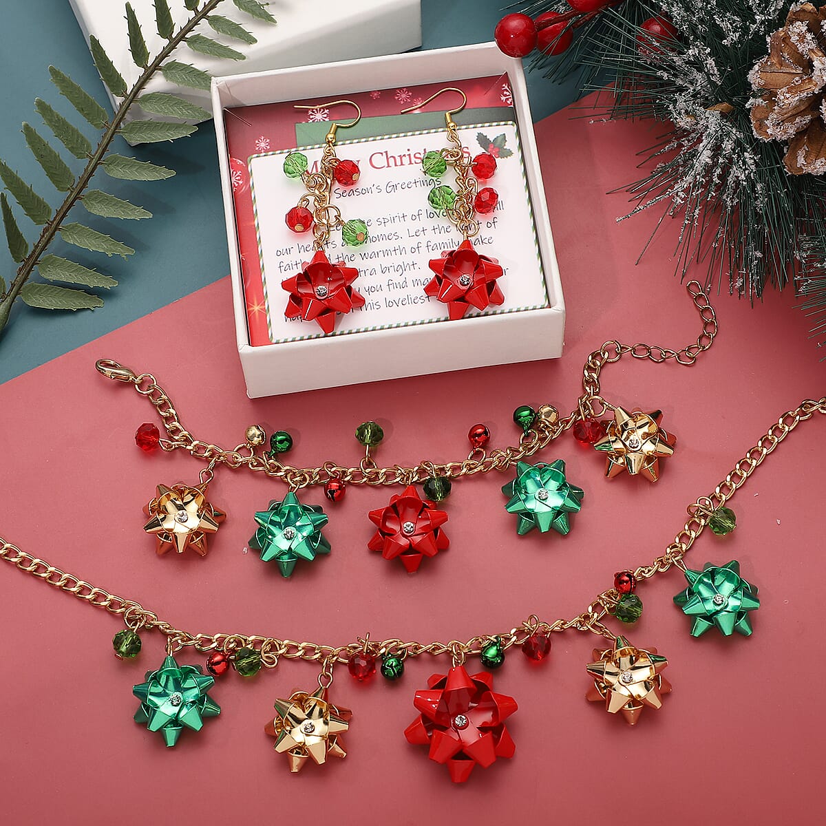 Merry Christmas Jewelry Gift Box with Multi Color Glass Ribbon Necklace 20In, Bracelet and Earrings in ION Plated Yellow Gold