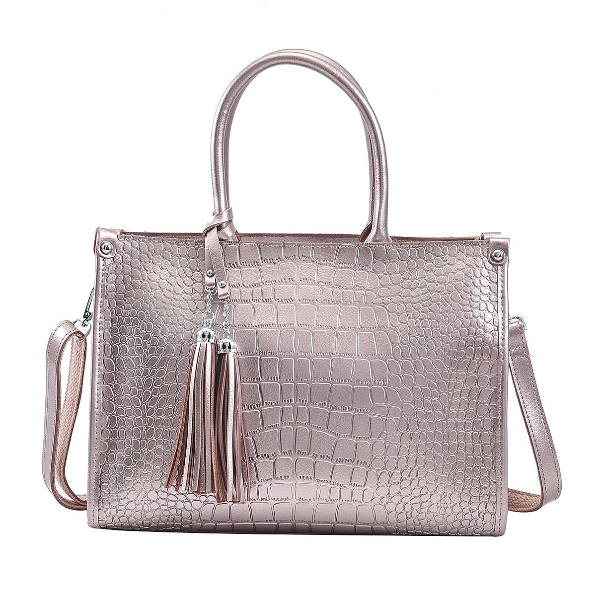 Metallic Rose Silver Crocodile Pattern Genuine Leather Convertible Tote Bag