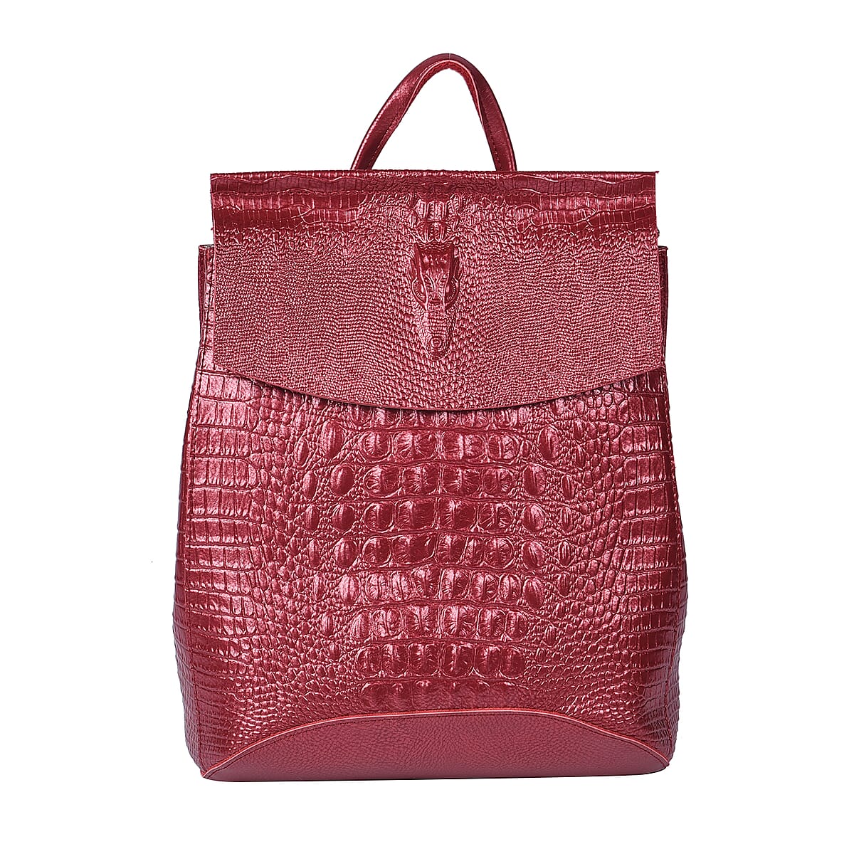 Metallic Wine Red Genuine Leather Crocodile Embossed Pattern Backpack with 37 Adjustable Shoulder Strap
