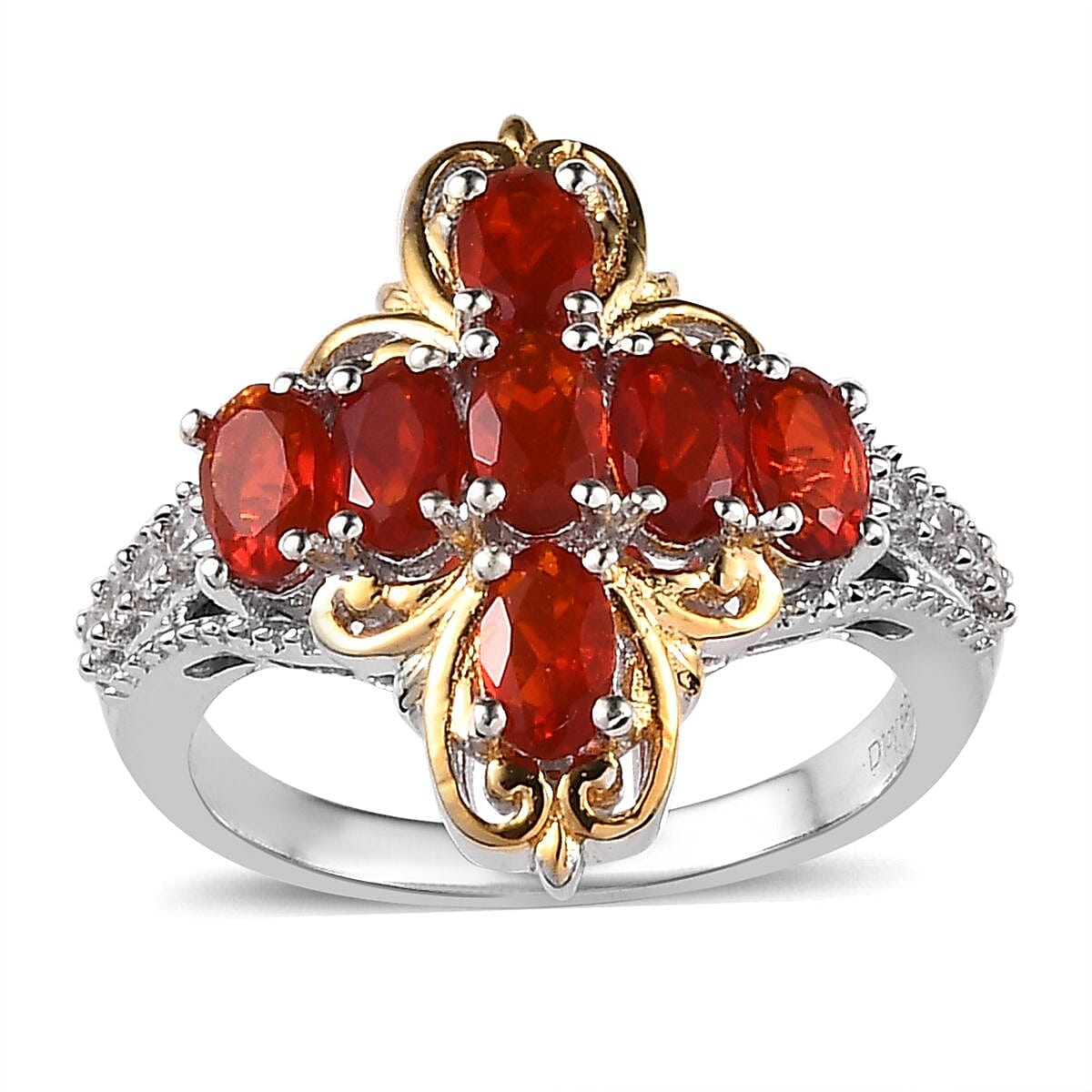 Dive into a mesmerizing journey with the Mexican cherry fire opal ring. Its unique cross design, adorned with oval-shaped gemstones and accentuated by radiant white zircon rounds, bridges the gap between spiritual depth and sophisticated glamour. Set against the backdrop of vermeil yellow gold and platinum over sterling silver, this ring beckons you to a divine statement of style.