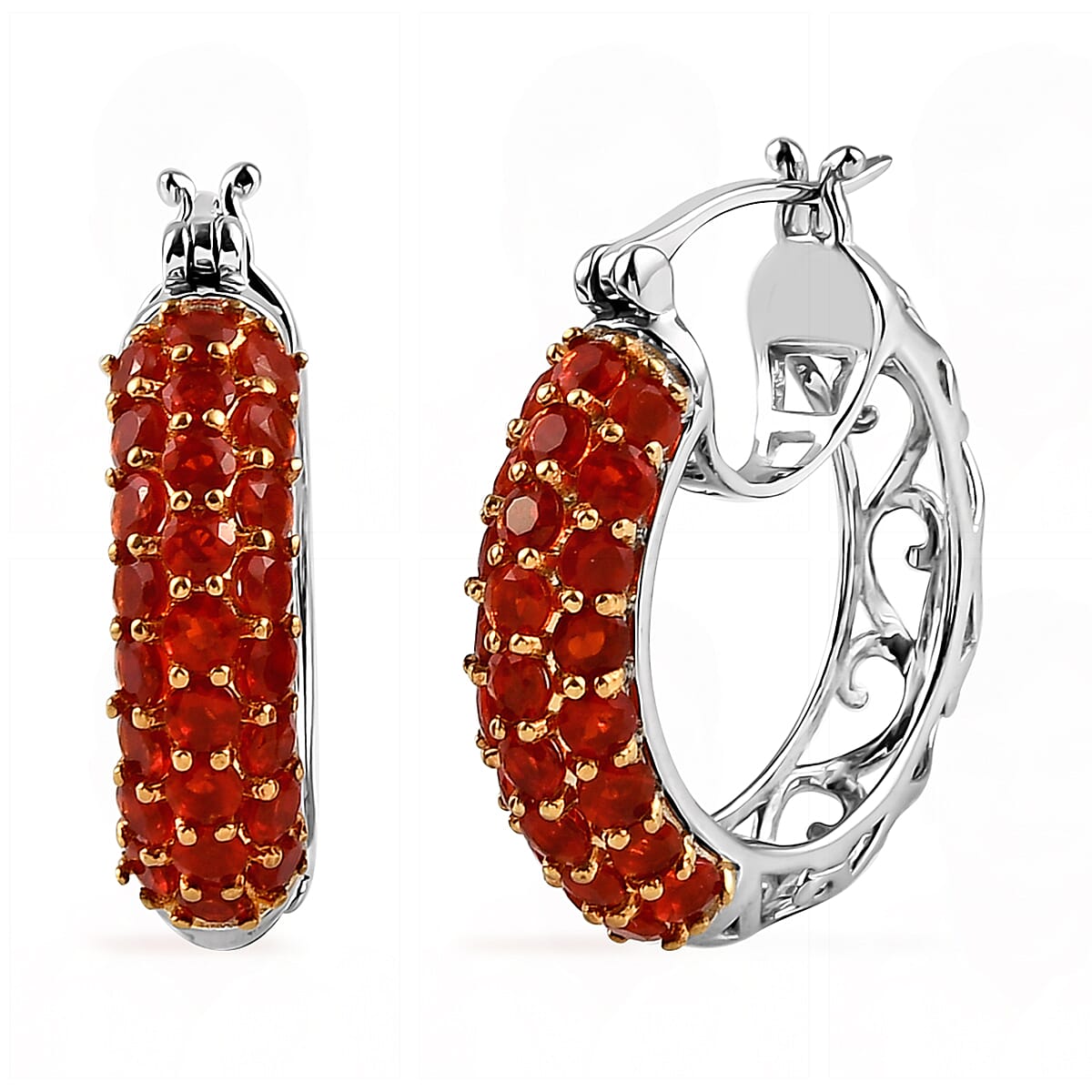 Mexican Cherry Fire Opal Hoop Earrings in Platinum Over Sterling Silver 7.25 Grams 2.30 ctw