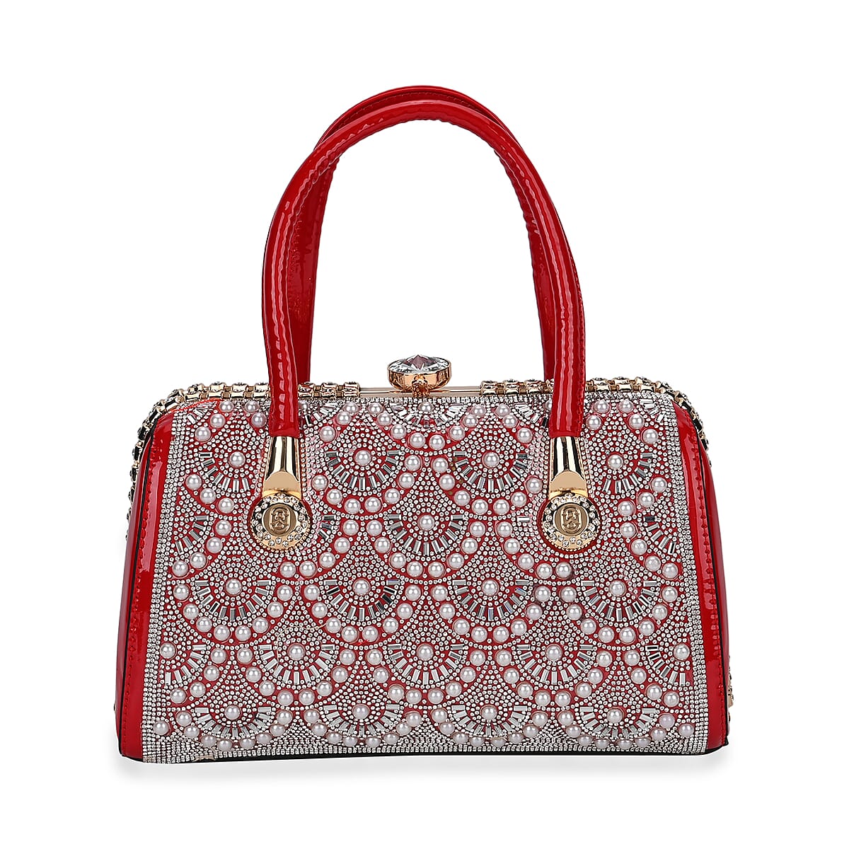 Miggie D Red Crystal and Pearl Faux Leather Tote Bag with Handle Drop