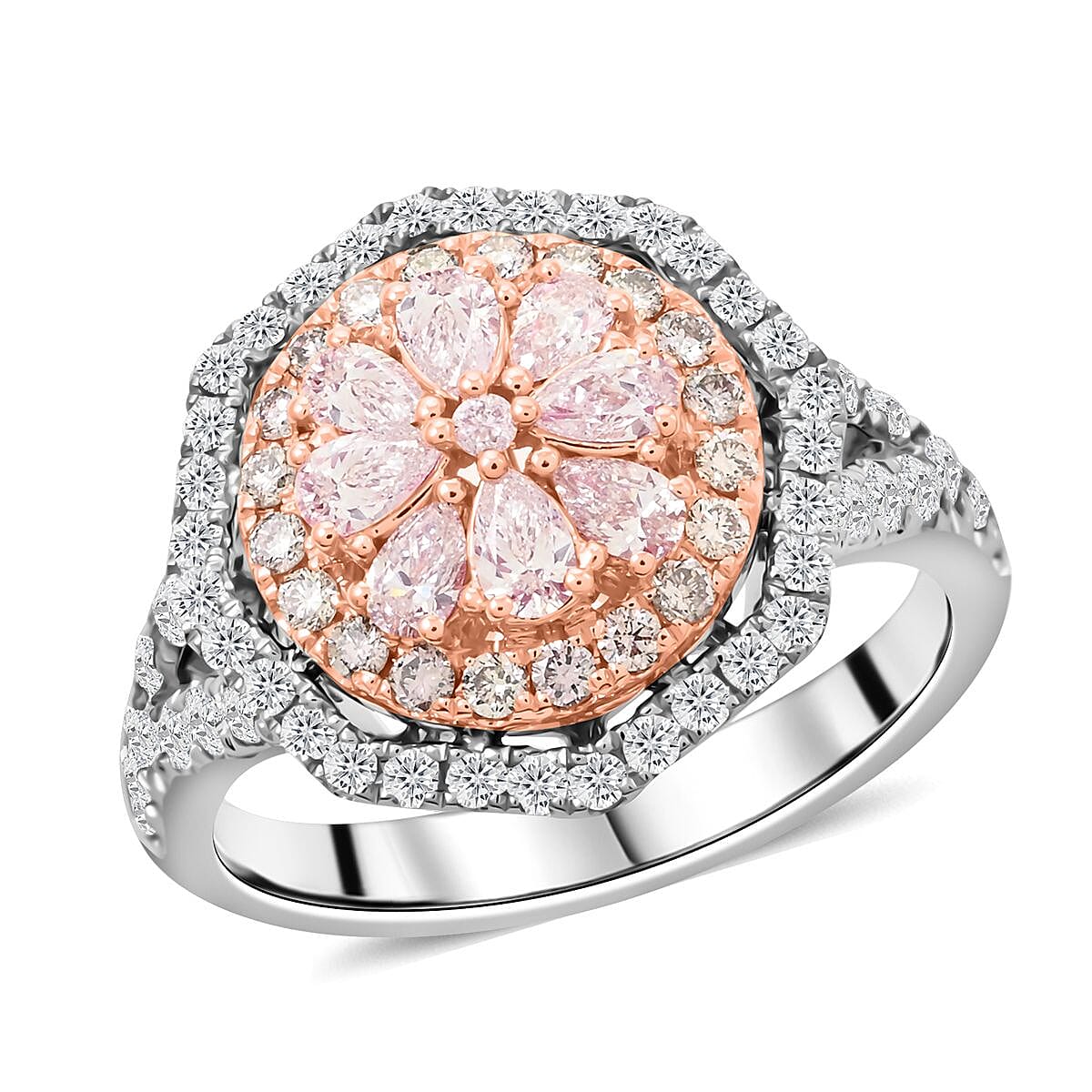 Crafted in 14K white and rose gold, this natural pink and white diamond ring showcases a prong-set pink diamond floral cluster in the center, surrounded by a white diamond outline. This diamond floral ring is adorned with a white diamond-studded split shank.