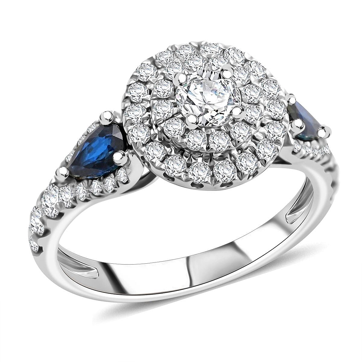 Enjoy the limelight wherever you go with this striking diamond ring from Modani. Multi-size diamonds are expertly prong set to form a radiant cluster. Pear-cut blue sapphires on each side over the shank add beauty and luxury to this stunning cocktail ring.