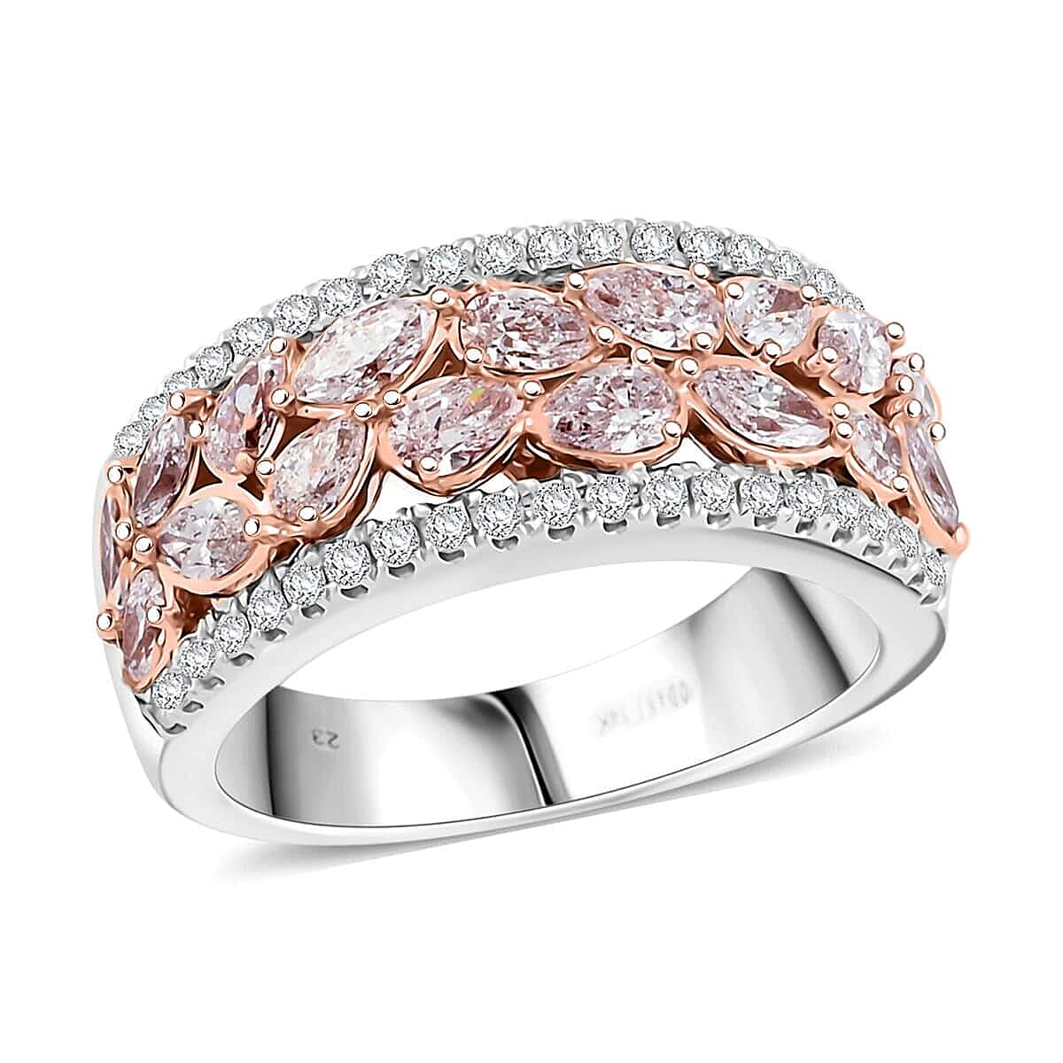 Embracing the elegance of dual tones, this natural pink and white diamond ring is crafte14K white and rose gold. The band ring features pink and white diamonds securely set in prong settings, combining elegance with enduring charm.