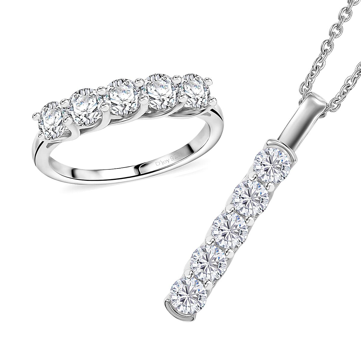 Moissanite 2.25 ctw 5 Stone Ring (Size 10.0) and Pendant in Rhodium Over Sterling Silver with Stainless Steel Necklace 20 Inches
