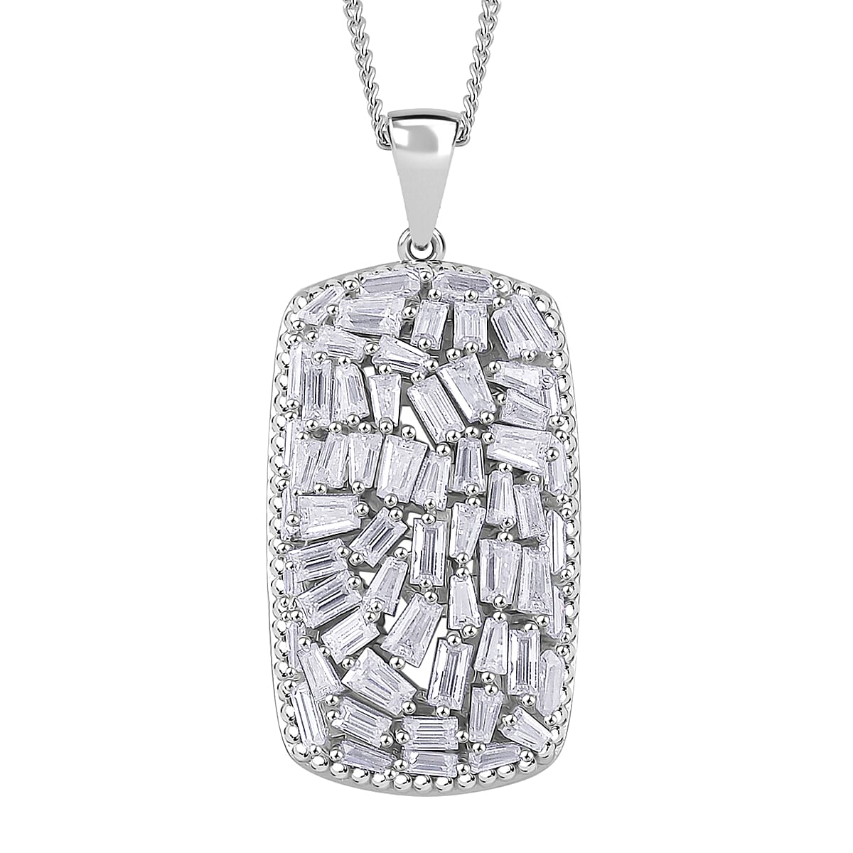 This moissanite pendant highlights a dazzling cluster of gems, elegantly arranged in a bold geometric shape. Expertly crafted in sterling silver, it combines contemporary design with timeless appeal. Suspended on a 20-inch chain, this sterling silver necklace effortlessly elevates any look.