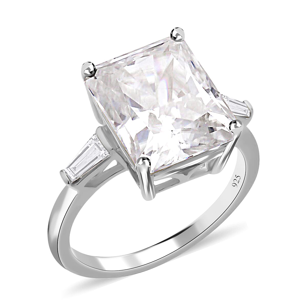 Moissanite 9.40 ctw Ring, Moissanite Three Stone Ring, Moissanite Trilogy Ring, Rhodium Over Sterling Silver Ring (Size 7.0)