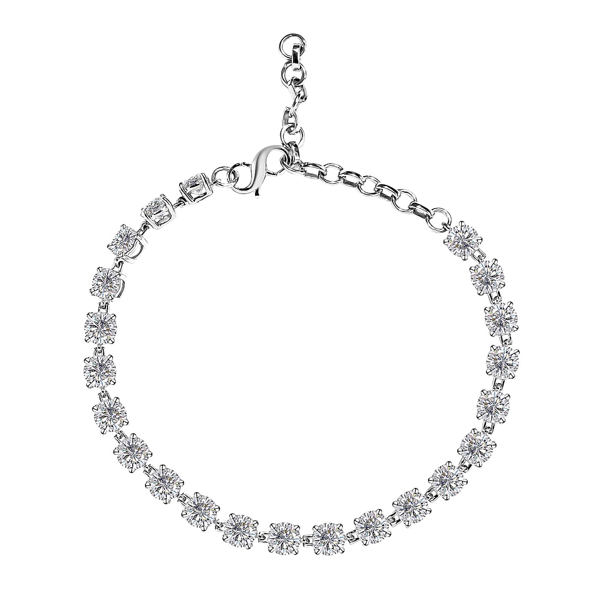 Inspired by the interconnectivity of links, this moissanite bracelet is designed to flourish a bold look. Link style symbolizes the connectivity and interdependence in the passage of life. The moissanites reflect the captivating arrangement, evoking the magnificence of the design. Round cut has a smooth pattern with rich texture from the edges that creates a distinctive pattern with the facets of the gemstone. The moissanites are shaped in this cut to maximize the luster and clarity of the gemstone. Moissanites hold more fire and brilliance with a refractive index higher than that of diamonds. This gemstone ranks nine on Moh’s scale of hardness. This moissanite bracelet is intricately designed with precision as the harmonious placement of the gemstone sustain oneness and uniformity in the design. This moissanite bracelet is meticulously designed in sterling silver, sustaining the long-term luster with an ensured durability. The hypoallergenic metal frame and durable gemstone makes it an ideal wear for all skin types in daily rotation. The lobster claw clasp gives a secure closure to the bracelet with a firm grip. This moissanite bracelet evokes an essence of magnificence lending versatility and freedom of wearing the exquisite designs.