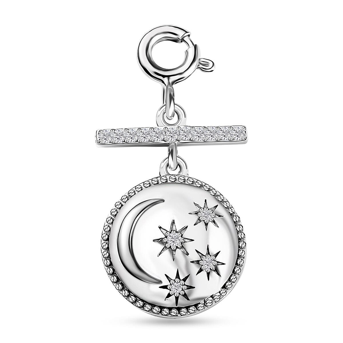 Moissanite Celestial Moon and Stars Coin Engraved Charm in Platinum Over Sterling Silver 0.15 ctw