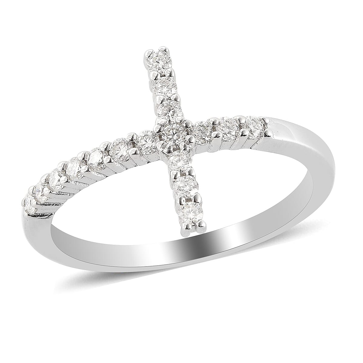 Moissanite Holy Cross Ring in Rhodium Over Sterling Silver (Size 7.0) 0.35 ctw