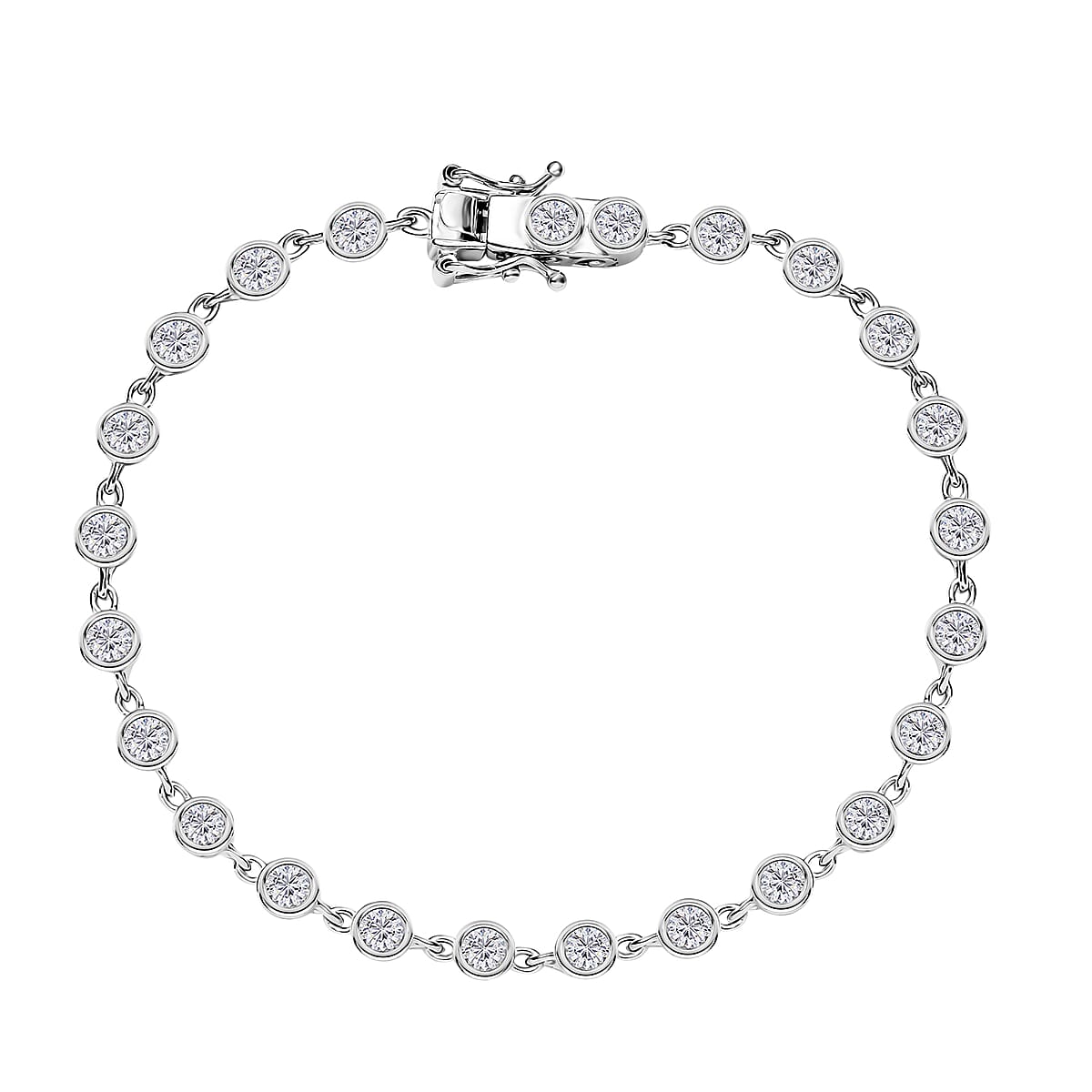 This sterling silver moissanite bracelet is a sophisticated piece designed for women. It showcases a series of brilliantly round-cut moissanite gems. Known for their durability and lustrous appeal, these gems are set securely in bezel settings, ensuring both style and longevity.