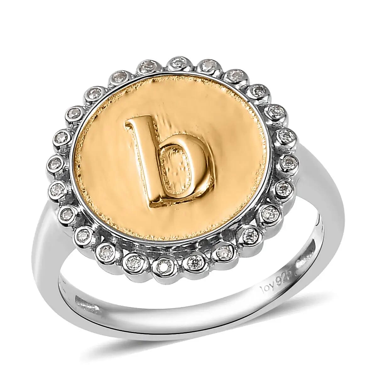 Moissanite Medallion Coin Initial B Ring in Vermeil Yellow Gold and Platinum Over Sterling Silver (Size 7.0) 0.10 ctw