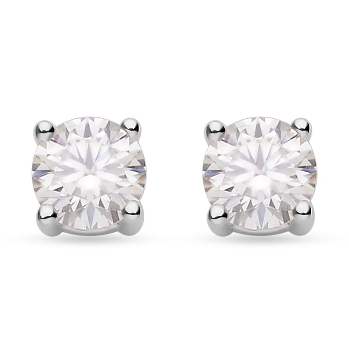 Shine brighter than a star with these moissanite studs. Moissanite is held with prongs for maximum brilliance. This round cut is unique and modern, resulting in a stunning and eye-catching design. These earrings are crafted in sterling silver with a fine finish.