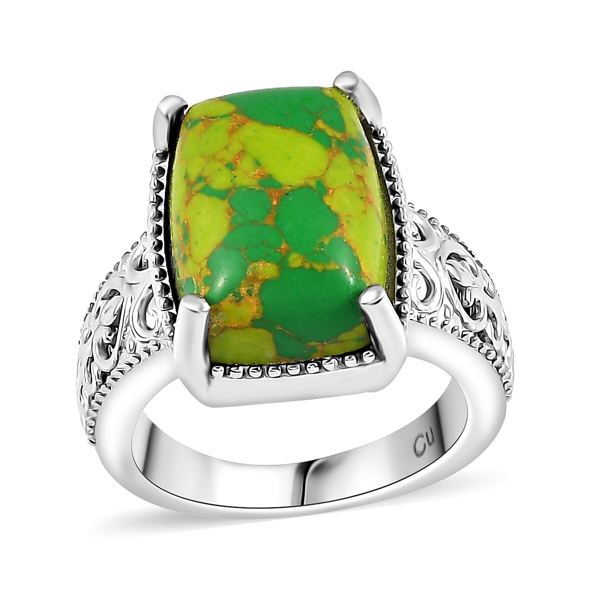 Immerse yourself in elegance with this vibrant turquoise solitaire ring. This turquoise ring features a prong-set cushion-shaped turquoise solitaire, nestled in platinum over copper with intricate scroll and milgrain metalwork.