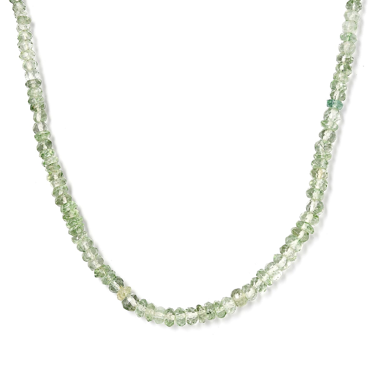 The Montezuma prasiolite beaded necklace is an elegant piece featuring prasiolite beads, renowned for their unique hue. This 18-inch necklace is crafted from durable sterling silver and includes a bolo slide clasp for an adjustable fit.