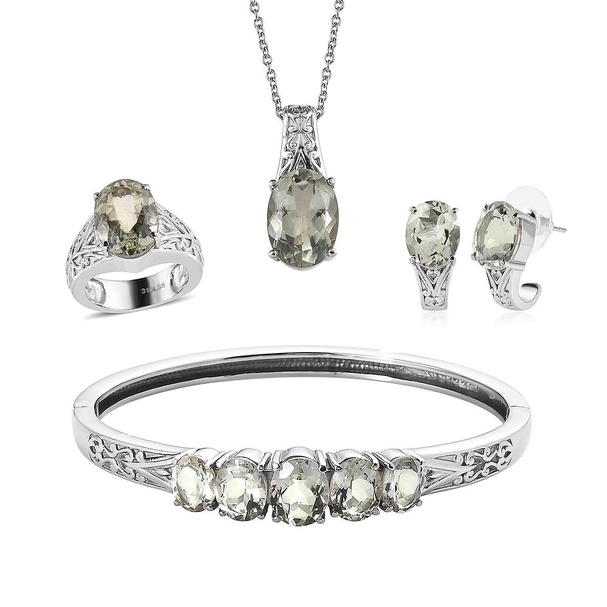 Montezuma Prasiolite 29.85 ctw Bangle Bracelet (7.25In), Earrings, Ring (Size 5.0) and Pendant Necklace 20 Inches in Stainless Steel