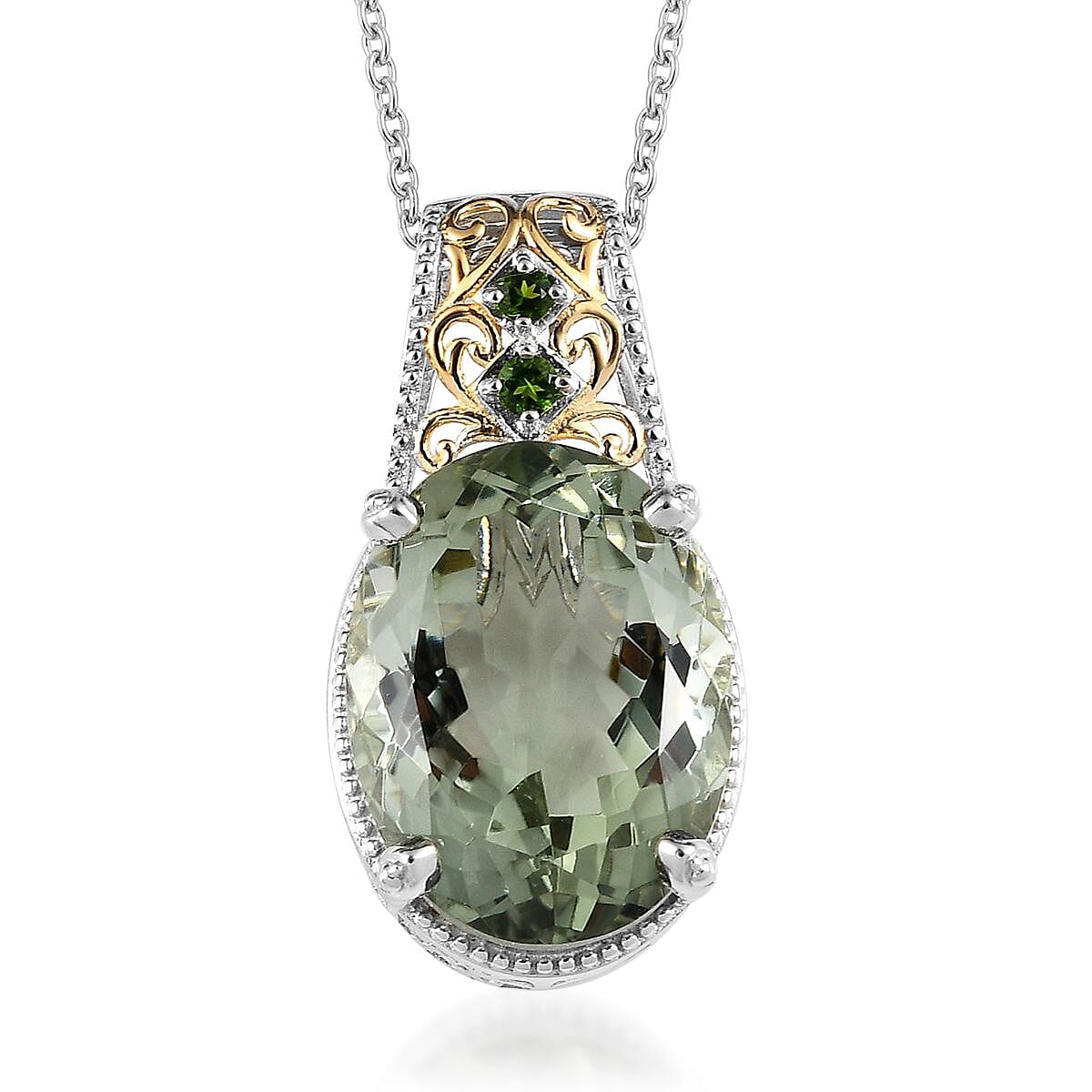 Montezuma Prasiolite and Chrome Diopside Pendant Necklace 20 Inches in Vermeil YG and Platinum Over Sterling Silver 19.00 ctw
