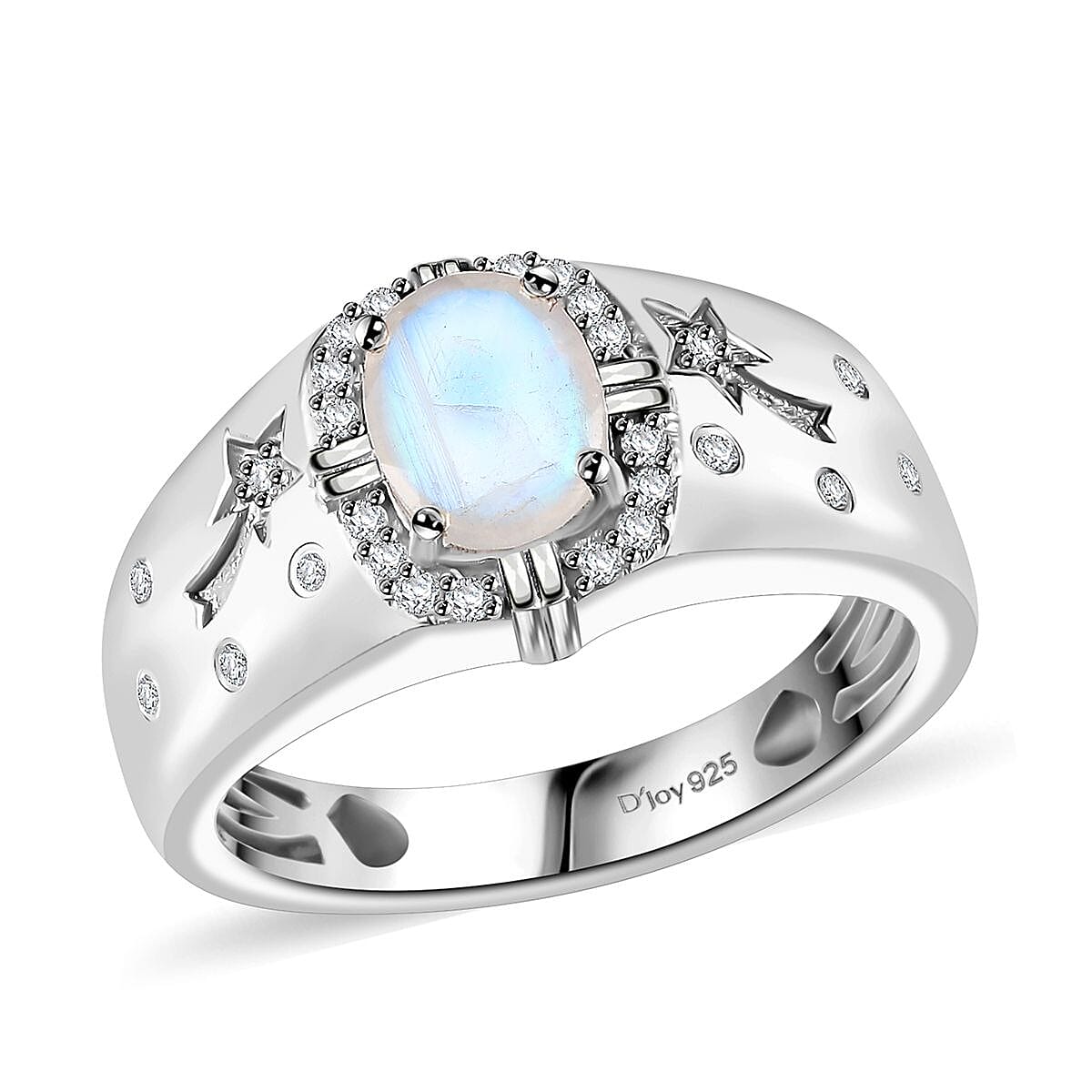 Moon Glow Moonstone and White Zircon Celestial Men's Ring in Rhodium Over Sterling Silver (Size 14.0) 1.40 ctw