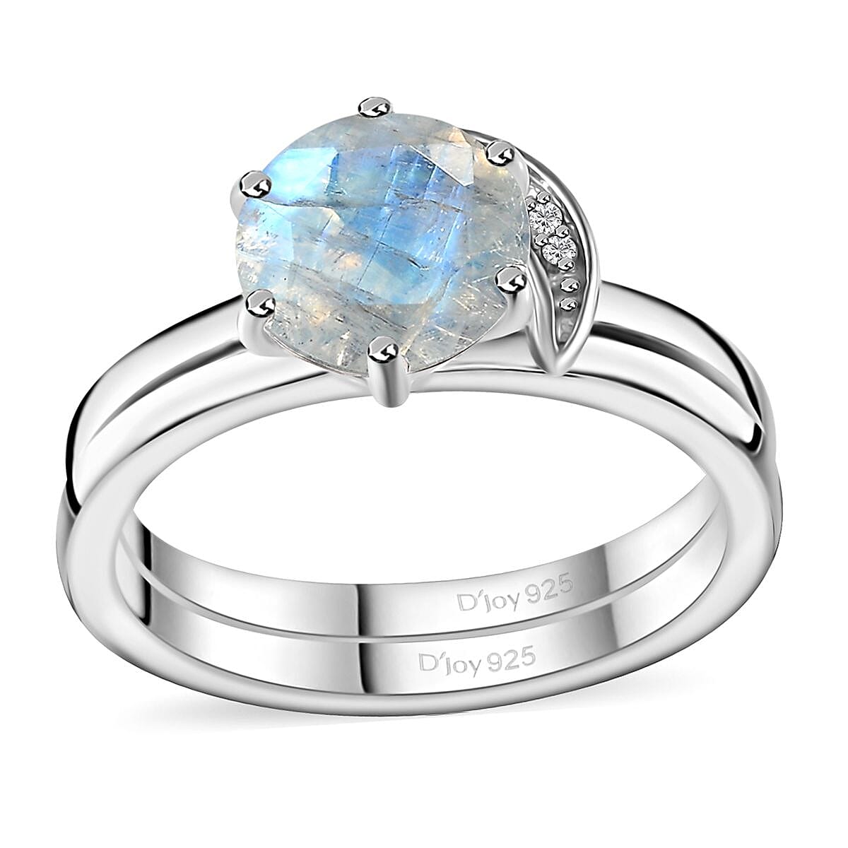This set of 2 stackable rings for women features moon glow moonstone and white zircon inspired by celestial beauty. Crafted in silver, these silver rings symbolize divine wisdom and light, offering durability and elegance for formal and casual wear.