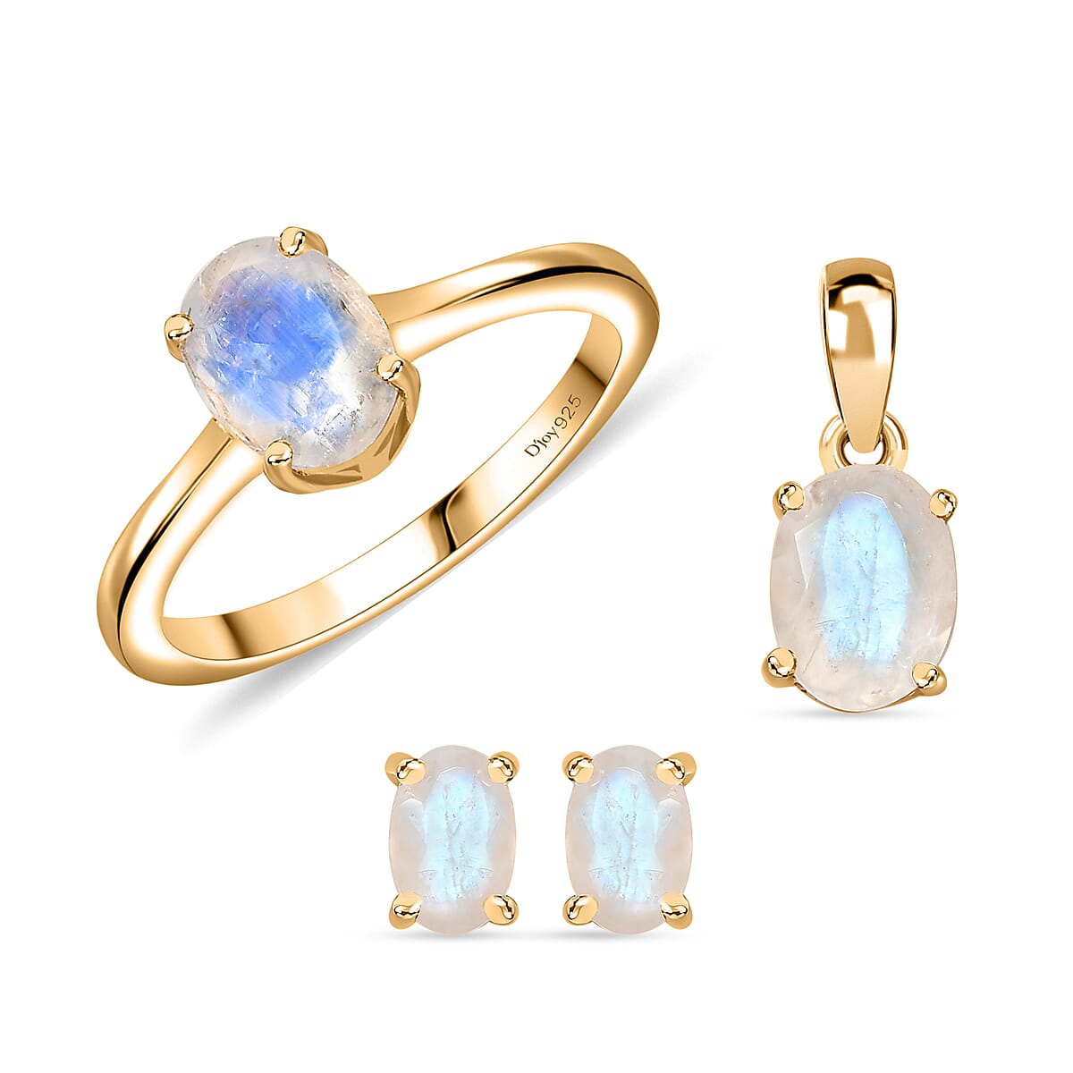 Moon Glow Moonstone Solitaire Stud Earrings, Ring (Size 6.0) and Pendant without Chain in 18K Vermeil Yellow Gold Over Sterling Silver 3.20 ctw
