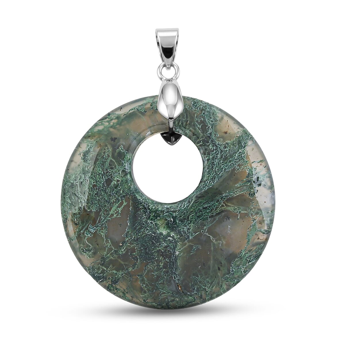 Moss Agate 52.35 ctw Donut Pendant in Silvertone with Stainless Steel Necklace (20 Inches)