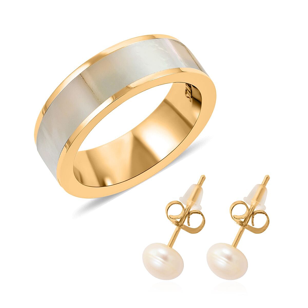 Mother Of Pearl and Freshwater Pearl Ring (Size 7.0) and Earrings in ION Plated YG Stainless Steel