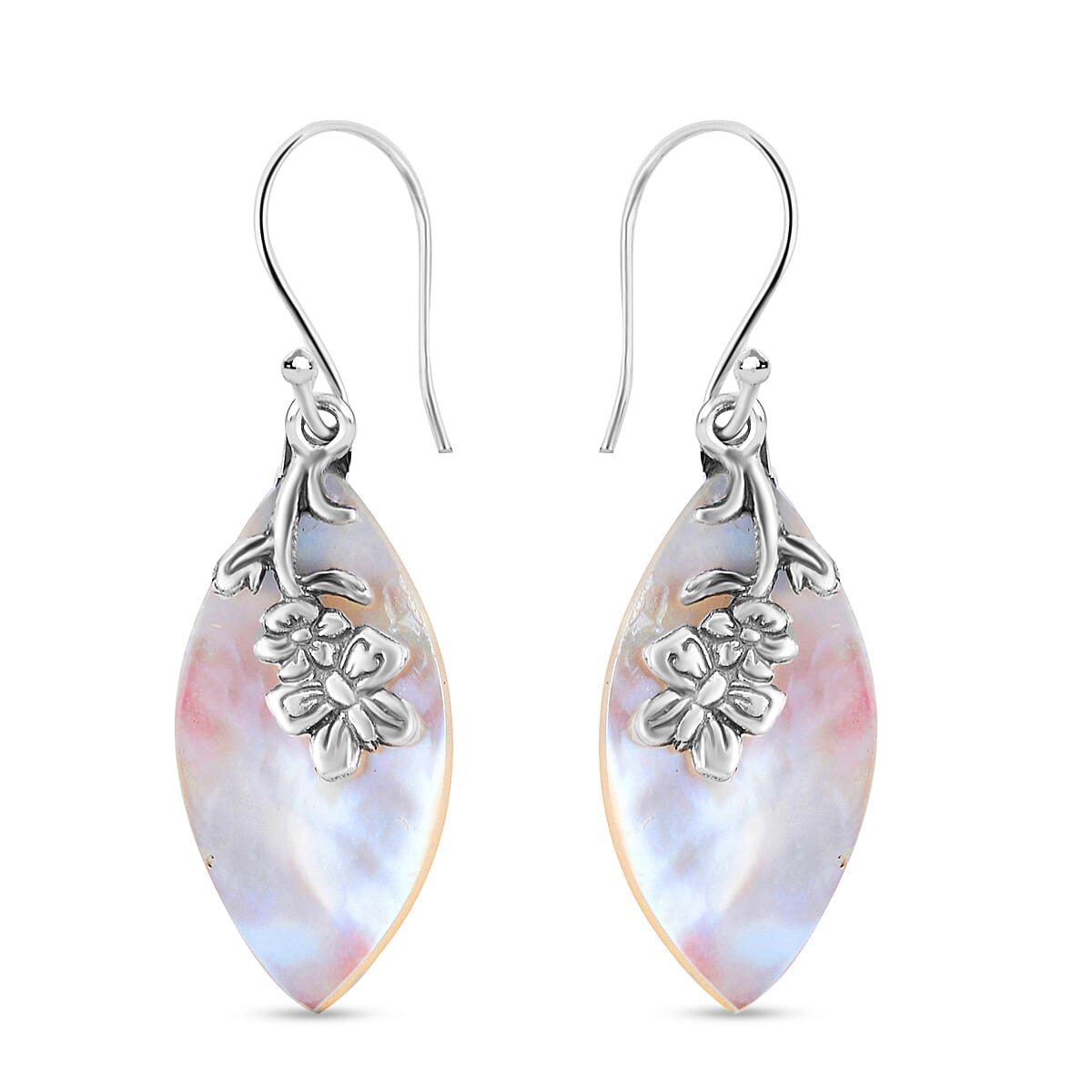 Make an impactful presence wherever you go wearing this gorgeous pair of drop earrings. This pair is enhanced with the mystical mother of pearl, carved in sterling silver for a bold appeal. Nature-inspired flower and butterfly motifs shine out in the earrings.