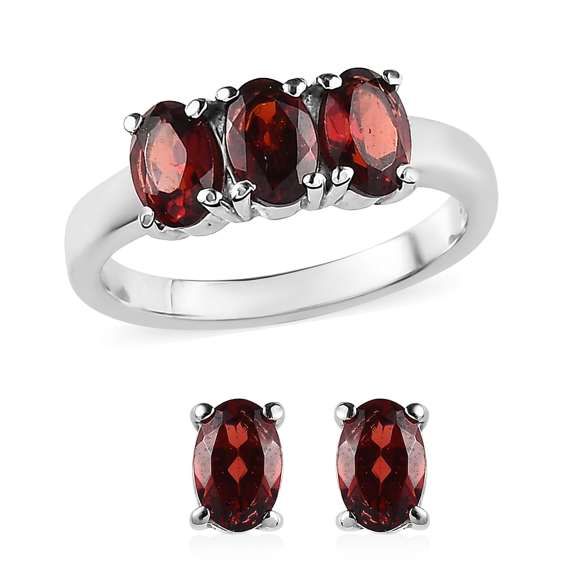 Mozambique Garnet 3 Stone Ring (Size 9.0) and Solitaire Stud Earrings in Stainless Steel 2.65 ctw
