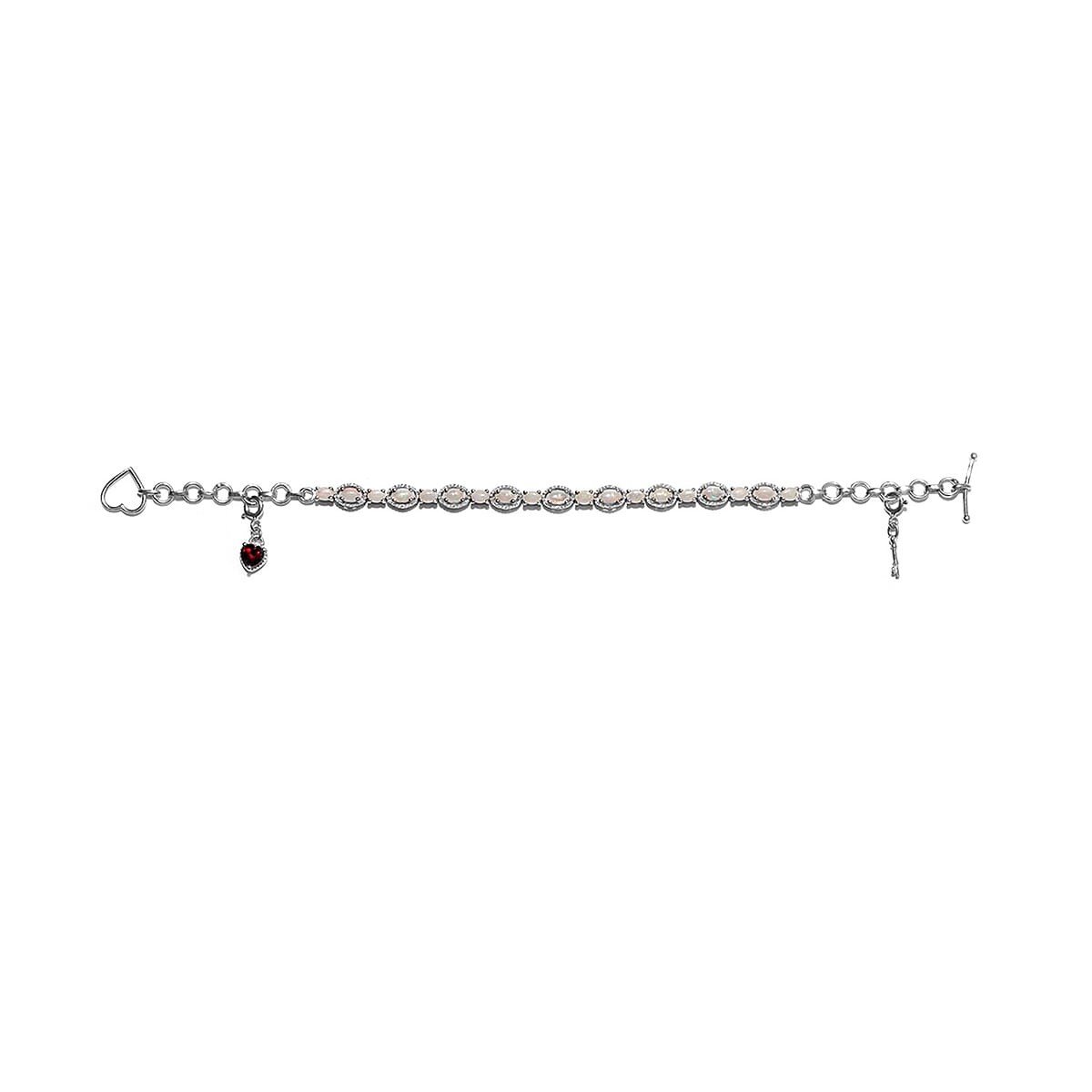 The Mozambique garnet and Australian white opal bracelet resonates with modern art. Australian white opals are symmetrically arranged in a row with heart-shaped Mozambique garnet, dangling at the end of the loop. This Mozambique garnet bracelet is crafted in sterling silver with a platinum finish to magnify the bracelet's luster. The toggle clasp offers a firm grip on the Australian white opal bracelet. Modern art symbolizes jewelry designs the surrealism.