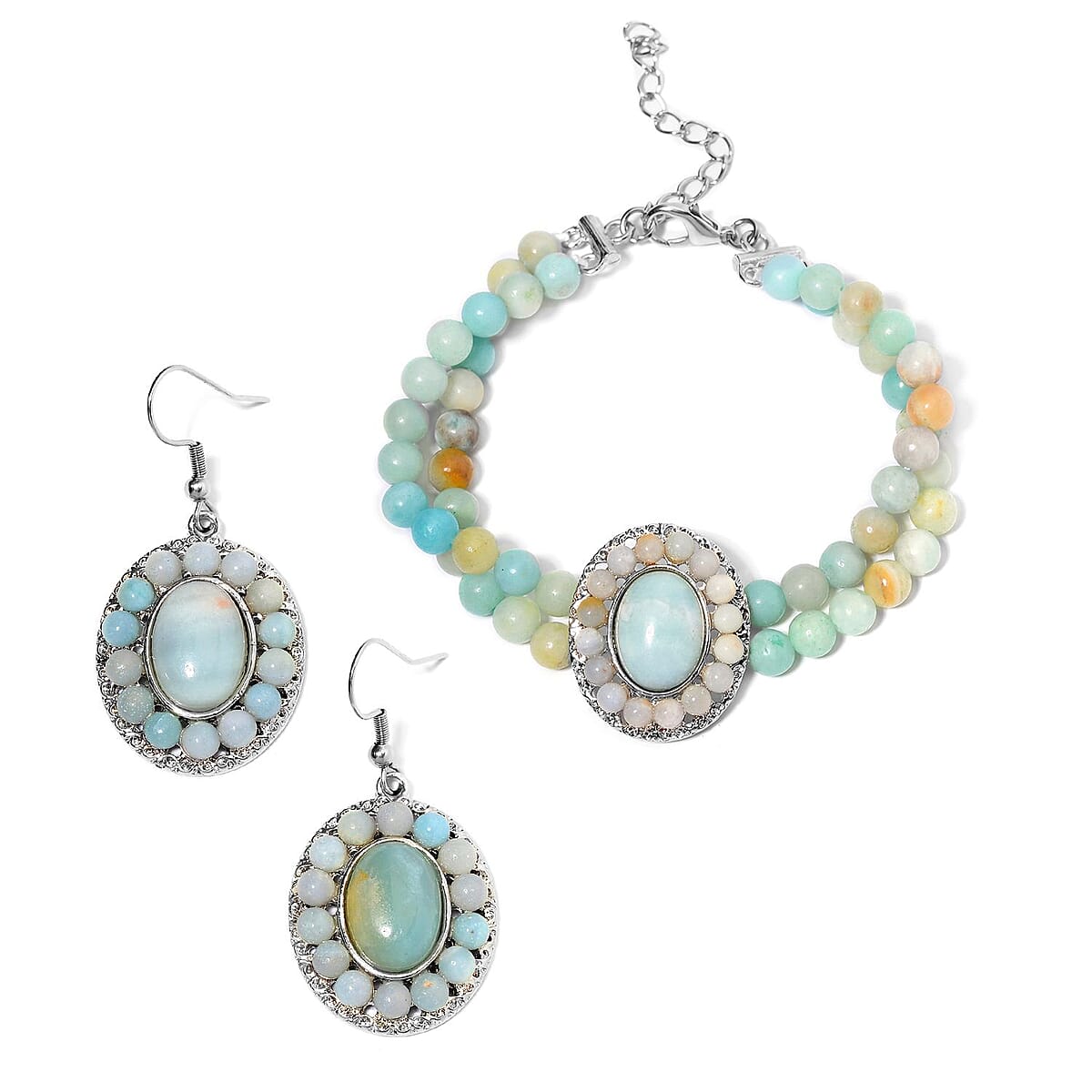 Multi Color Amazonite Halo Dangle Earrings and Double Row Bracelet (8.0-10.0In) in Silvertone 140.60 ctw