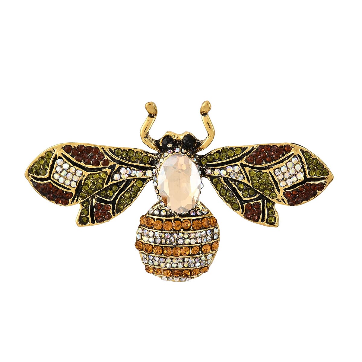 Multi Color Austrian Crystal and Green Glass Bee Brooch in Goldtone