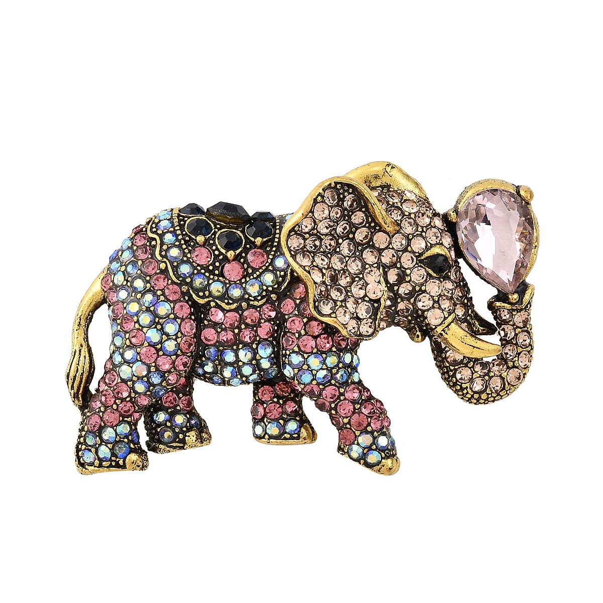 Multi Color Austrian Crystal and Pink Glass Elephant Brooch in Goldtone