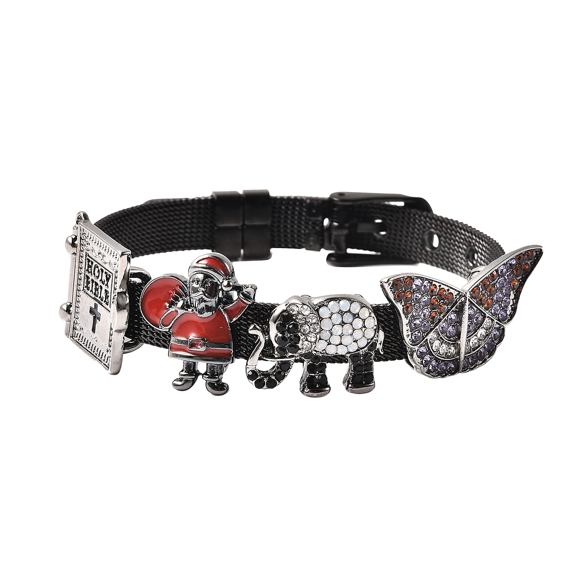 Artistically curated charm bracelet. Embellished with multi-colored Austrian crystals and multi charms to grace this jewel. It has four gorgeous charms- enameled butterfly, Santa, a holy bible, and an adorable elephant. This lustrous beauty has a decent size of 6.00-7.50- inch.