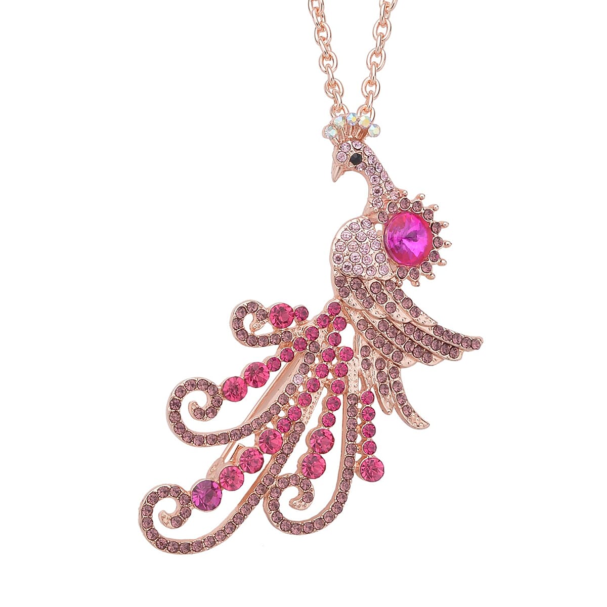 Multi Color Austrian Crystal, Fuchsia Glass and Enameled Peacock Brooch or Pendant Necklace 28-30 Inches in Goldtone