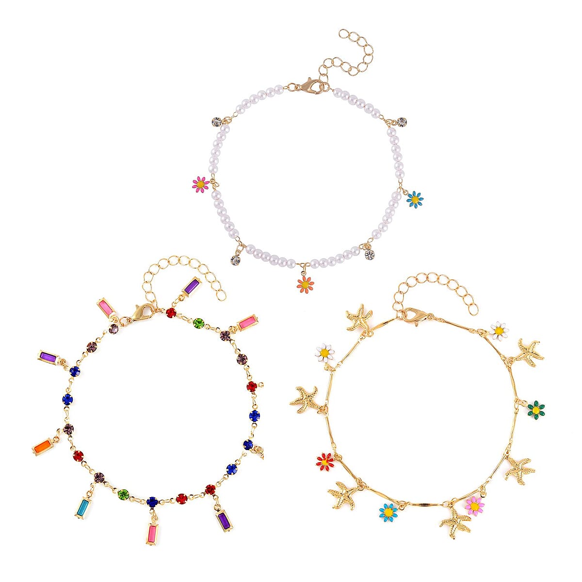 Multi Color Austrian Crystal, Multi Gemstone Enameled Set of 3 Flower, Beaded and Star Anklet in Goldtone (8.5-10.5In, 9-11In)