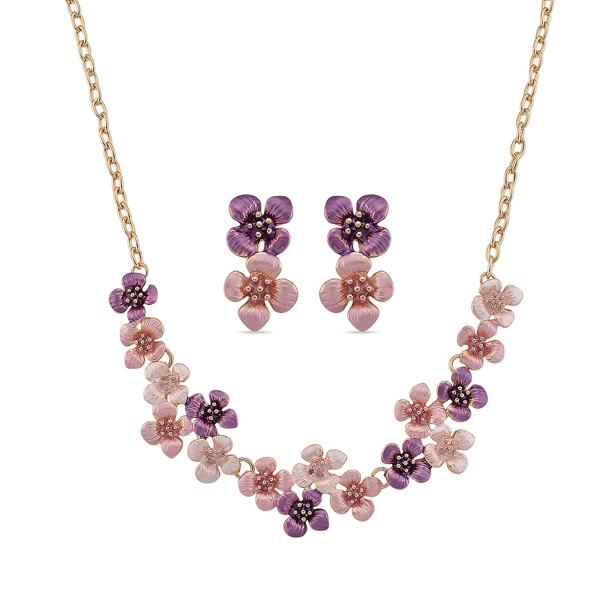 Multi Color Enameled Floral Necklace (20.5-22.5 Inches) and Earrings in Goldtone