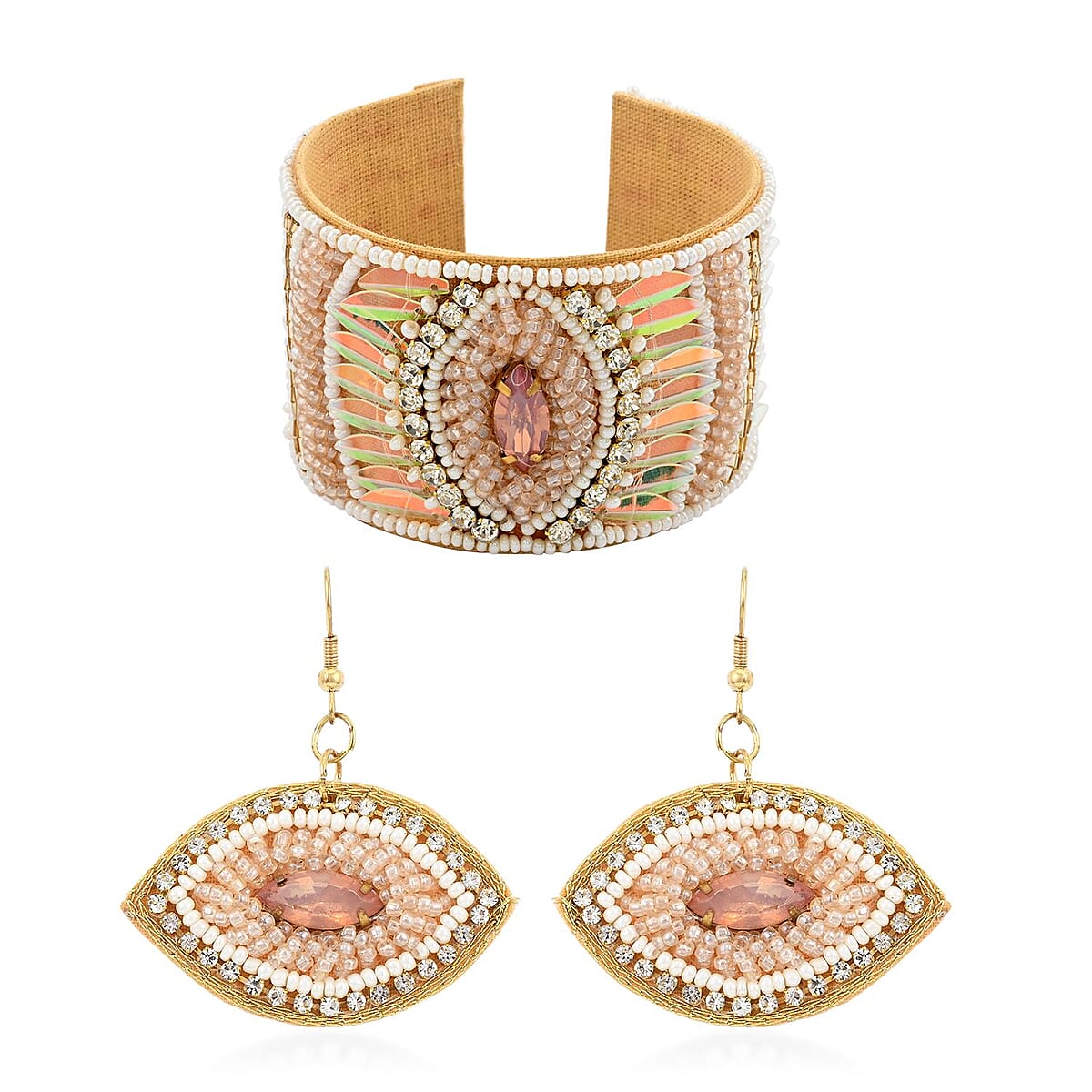 Multi Color Glass Seed Beaded Cuff Bracelet (7.0 In) and Dangle Earrings in Goldtone