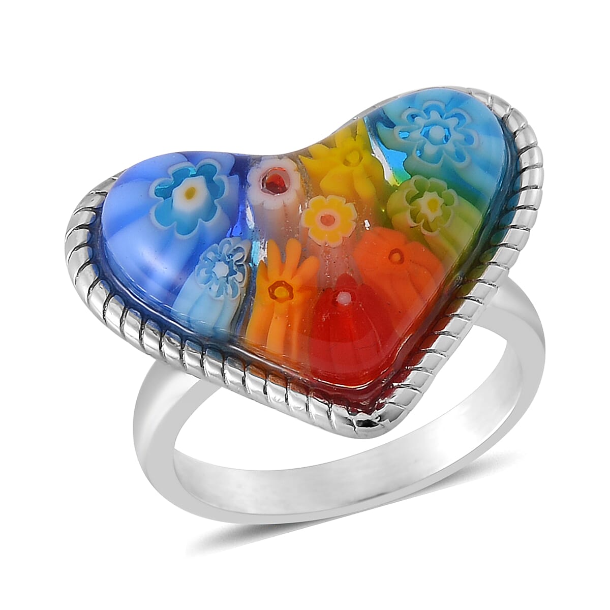 This multi-color Murano-style heart ring features Millefiori glasswork, coveted for its intricate and detailed design. Crafted in 316L stainless steel, it offers a smooth finish, combining durability with versatile styling for both casual and formal wear.